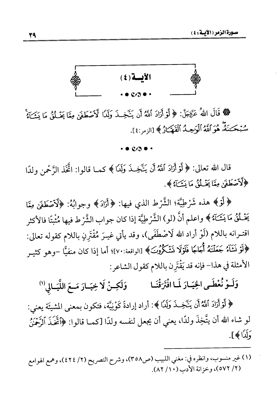 {لَوْ} هذه شَرْطِيَّة؛ الشَّرْط الذي فيها: {أَرَادَ} وجوابُهُ: {لَاصْطَفَى مِمَّا يَخْلُقُ مَا يَشَاءُ} واعلم أنَّ (لو) الشَّرْطِيَّة إذا كان جواب الشَّرْط فيها مُثْبتًا فالأكثر اقترانه باللام (لَوْ أراد الله لَاصْطَفَى)، وقد يأتي غيرَ مُقْتَرِنٍ باللام كقوله تعالى: {لَوْ نَشَاءُ جَعَلْنَاهُ أُجَاجًا فَلَوْلَا تَشْكُرُونَ} [الواقعة: ٧٠]؛ أما إذا كان منفيًّا - وهو كثير الأمثلة في هذا - فإنه قد يَقْتَرِن باللام كقول الشاعر:
