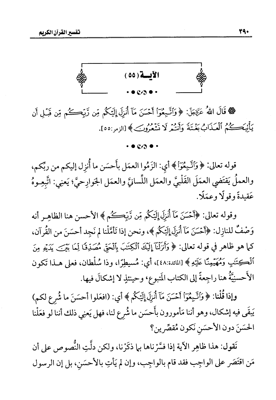 وقوله تعالى: {أَحْسَنَ مَا أُنْزِلَ إِلَيْكُمْ مِنْ رَبِّكُمْ} الأحسن هنا الظاهِر أنه وَصْفٌ للنازِل: {أَحْسَنَ مَا أُنْزِلَ إِلَيْكُمْ}، ونحن إذا تَأمَّلْنا لم نَجِد أحسَنَ من القُرآن، كما هو ظاهر في قوله تعالى: {وَأَنْزَلْنَا إِلَيْكَ الْكِتَابَ بِالْحَقِّ مُصَدِّقًا لِمَا بَيْنَ يَدَيْهِ مِنَ الْكِتَابِ وَمُهَيْمِنًا عَلَيْهِ} [المائدة: ٤٨]، أي: مُسيطِرًا، وذا سُلْطان، فعلى هذا تَكون الأَحسنِيَّةُ هنا راجِعةً إلى الكتاب المَتبوع، وحينئذٍ لا إشكالَ فيها.