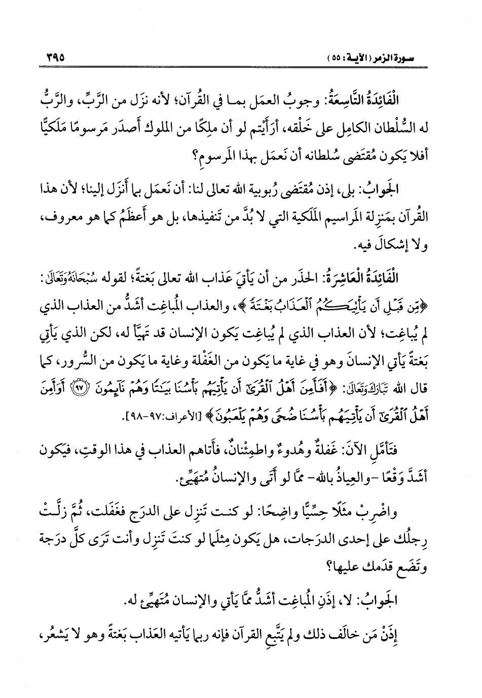 الْفَائِدَةُ التَّاسِعَةُ: وجوبُ العمَل بما في القُرآن؛ لأنه نزَل من الرَّبِّ، والرَّبُّ له السُّلْطان الكامِل على خَلْقه، أرَأَيْتم لو أن ملِكًا من الملوك أَصدَر مَرسومًا مَلَكيًّا أفلا يَكون مُقتَضى سُلطانه أن نَعمَل بهذا المَرسومِ؟