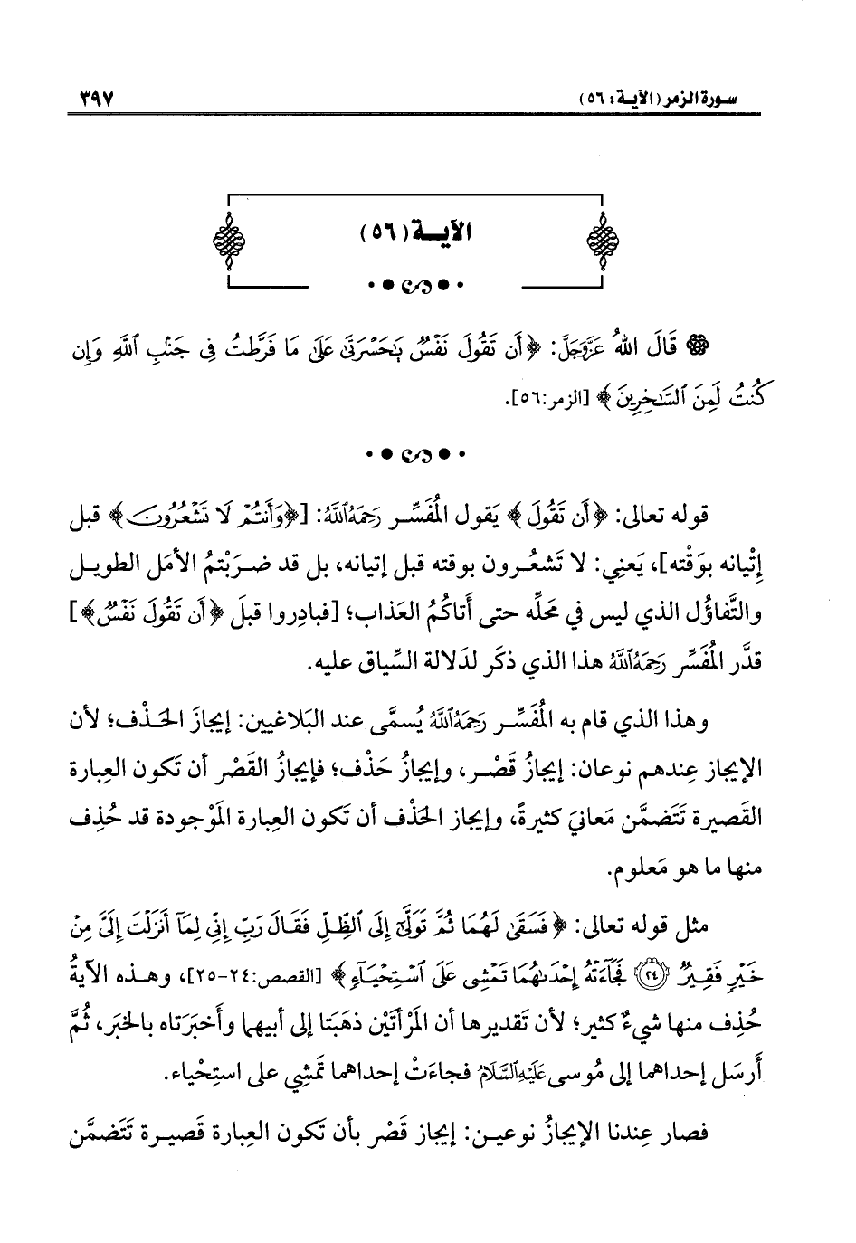 قوله تعالى: {أَنْ تَقُولَ} يَقول المُفَسِّر رَحِمَهُ اللهُ: [{وَأَنْتُمْ لَا تَشْعُرُونَ} قبل إِتْيانه بوَقْته]، يَعنِي: لا تَشعُرون بوقته قبل إتيانه، بل قد ضرَبْتمُ الأمَل الطويل والتَّفاؤُل الذي ليس في مَحلِّه حتى أَتاكُمُ العَذاب؛ [فبادِروا قبلَ {أَنْ تَقُولَ نَفْسٌ}] قدَّر المُفَسِّر رَحِمَهُ اللهُ هذا الذي ذكَر لدَلالة السِّياق عليه.
