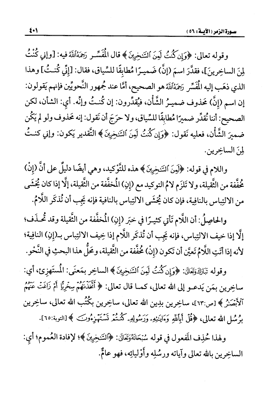 وقوله تعالى: {وَإِنْ كُنْتُ لَمِنَ السَّاخِرِينَ} قال المُفَسَّر رَحِمَهُ اللهُ فيه: [وإني كُنْتُ لمِنَ الساخِرينَ]، فقدَّرَ اسمَ (إنَّ) ضَميرًا مُطابِقًا للسِّياق، فقال: [إِنِّي كُنتُ] وهذا الذي ذهَب إليه المُفَسِّر رَحِمَهُ اللهُ هو الصحيح، أمَّا عند جُمهور النَّحويِّين فإنهم يَقولون: إن اسم (إِنَّ) محَذوف ضميرُ الشَّأْن، فيُقدِّرون: إن كُنتُ وإنَّه. أيِ: الشأن، لكن الصحيح: أننا نُقدِّر ضميرًا مُطابقًا للسِّياق، ولا حرَجَ أن نَقول: إنه مَحذوف ولو لم يَكُن ضميرَ الشَّأْن، فعليه نَقول: {وَإِنْ كُنْتُ لَمِنَ السَّاخِرِينَ} التَّقدير يَكون: وإني كنتُ لمِنَ الساخِرين.
