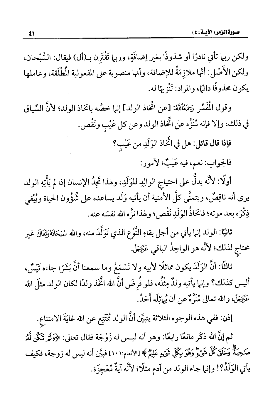 وقول المُفَسِّر رَحِمَهُ اللهُ: [عن اتِّخاذ الولد] إنما خصَّه باتخاذ الولد؛ لأنَّ السِّياق في ذلك، وإلا فإنه مُنَزَّه عن اتِّخاذ الولد وعن كل عَيْبٍ ونَقْص.