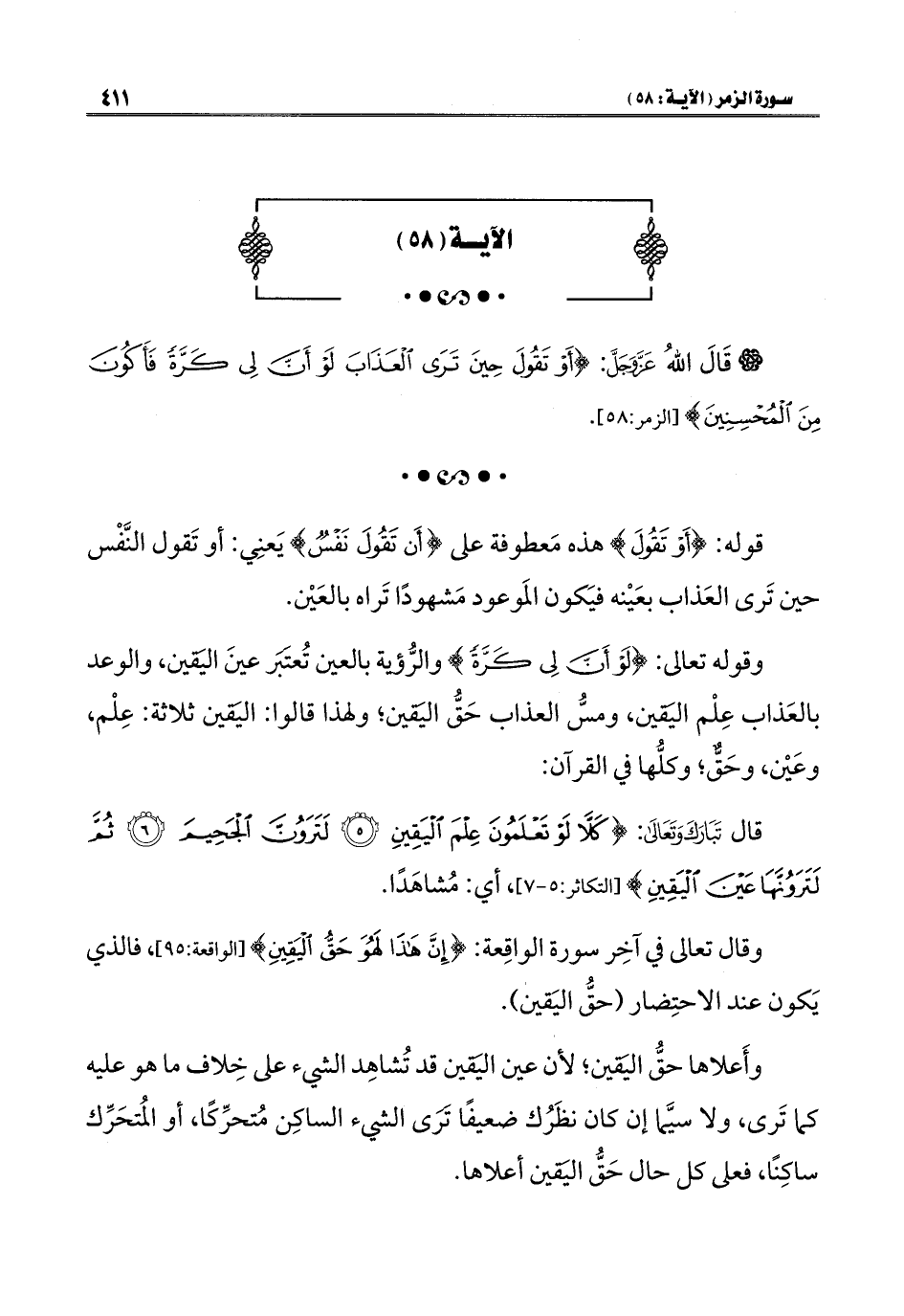 * قَالَ اللهُ عَزَّ وَجَلَّ: {أَوْ تَقُولَ حِينَ تَرَى الْعَذَابَ لَوْ أَنَّ لِي كَرَّةً فَأَكُونَ مِنَ الْمُحْسِنِينَ} [الزمر: ٥٨].