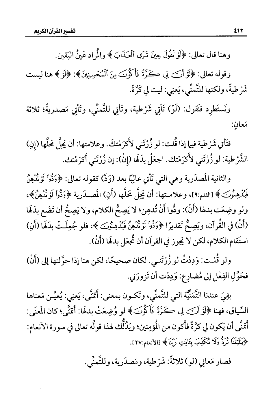 بقِيَ عندنا التَّمَنِّيَّة التي للتَّمنِّي، وتَكون بمعنى: أَتمَنَّى، يَعنِي: يُعيِّن مَعناها السِّياق، فهنا {لَوْ أَنَّ لِي كَرَّةً فَأَكُونَ} لو وُضِعَتْ بدلَها: أَتمَنَّى؛ كان المَعنَى: أَتمنَّى أن يَكون لي كرَّةٌ فأَكون من المُؤمِنين؛ ويَدُلُّك لهذا قولُه تعالى في سورة الأنعام: {يَالَيْتَنَا نُرَدُّ وَلَا نُكَذِّبَ بِآيَاتِ رَبِّنَا} [الأنعام: ٢٧].