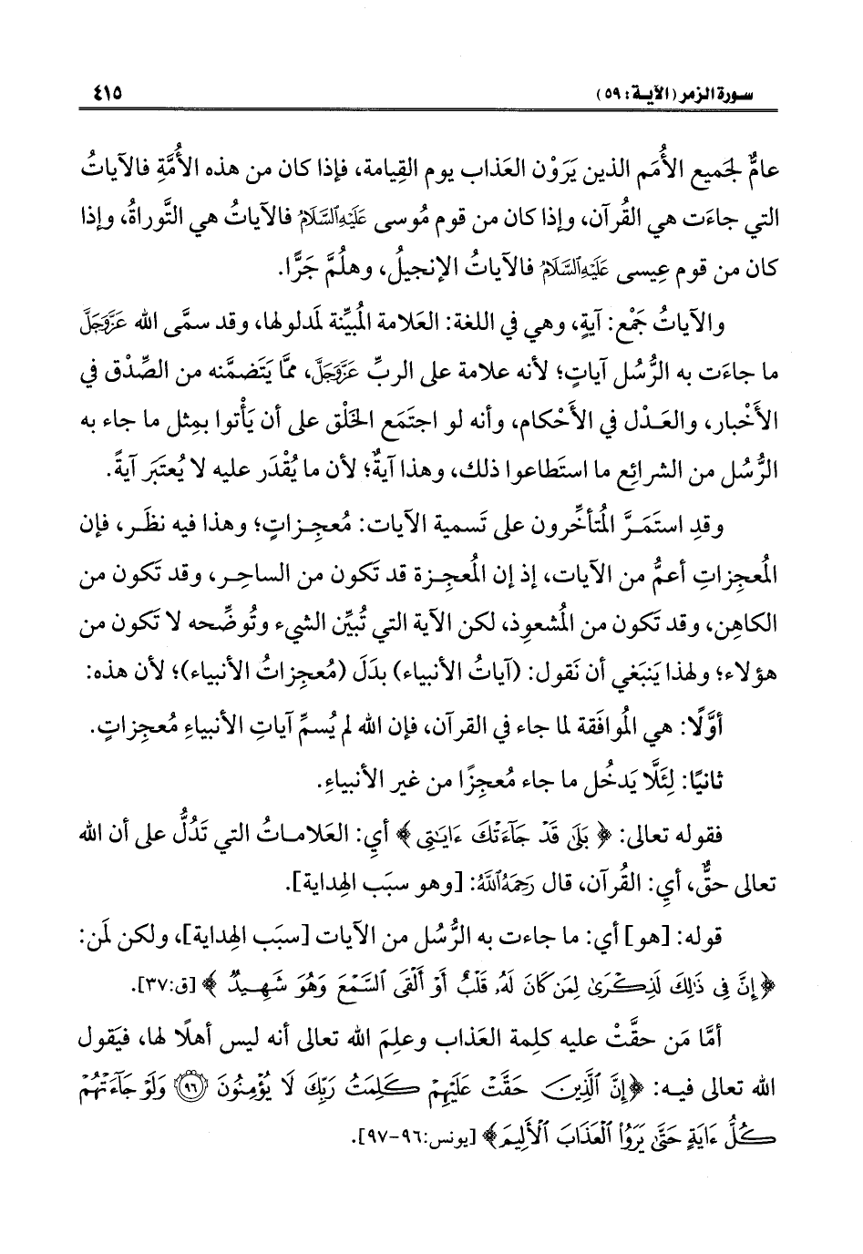 وقدِ استَمَرَّ المُتأخِّرون على تَسمية الآيات: مُعجِزاتٍ؛ وهذا فيه نظَر، فإن المُعجِزاتِ أعمُّ من الآيات، إذ إن المُعجِزة قد تَكون من الساحِر، وقد تَكون من الكاهِن، وقد تَكون من المُشعوِذ، لكن الآية التي تُبيِّن الشيء وتُوضِّحه لا تَكون من هؤلاء؛ ولهذا يَنبَغي أن نَقول: (آياتُ الأنبياء) بدَلَ (مُعجِزاتُ الأنبياء)؛ لأن هذه: