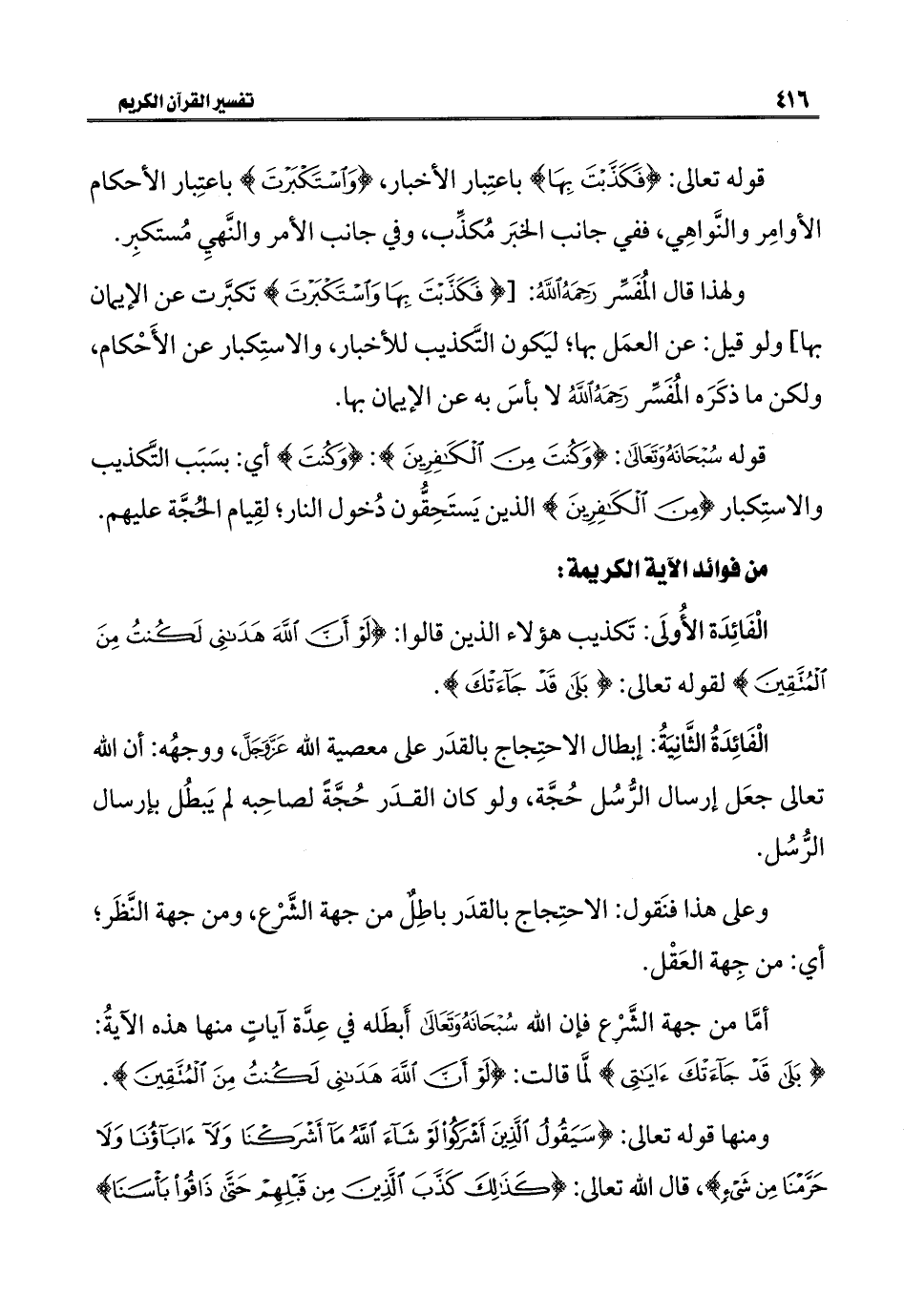 ولهذا قال المُفَسِّر رَحِمَهُ اللهُ: [{فَكَذَّبْتَ بِهَا وَاسْتَكْبَرْتَ} تَكبَّرت عن الإيمان بها] ولو قيل: عن العمَل بها؛ ليَكون التَّكذيب للأخبار، والاستِكبار عن الأَحْكام، ولكن ما ذكَرَه المُفَسِّر رَحِمَهُ اللهُ لا بأسَ به عن الإيمان بها.