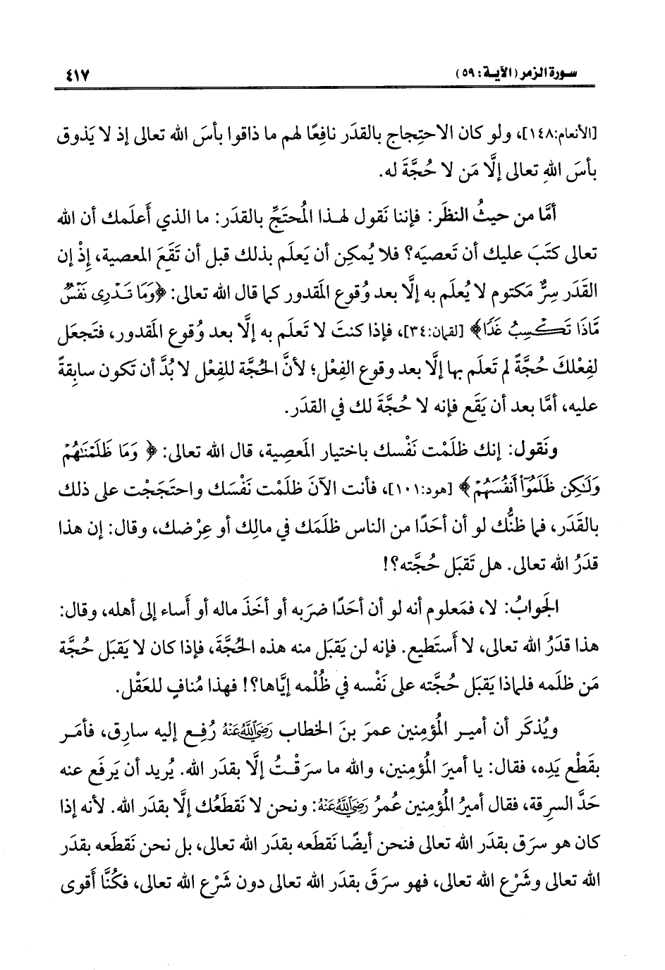 ويُذكَر أن أمير المُؤمِنين عمرَ بنَ الخطاب - رضي الله عنه - رُفِع إليه سارِق، فأمَر بقَطْع يَدِه، فقال: يا أميرَ المُؤمِنين، والله ما سرَقْتُ إلَّا بقدَر الله. يُريد أن يَرفَع عنه حَدَّ السرِقة، فقال أميرُ المُؤمِنين عُمرُ - رضي الله عنه -: ونحن لا نَقطَعُك إلَّا بقدَر الله. لأنه إذا كان هو سرَق بقدَر الله تعالى فنحن أيضًا نَقطَعه بقدَر الله تعالى، بل نحن نَقطَعه بقدَر الله تعالى وشَرْع الله تعالى، فهو سرَقَ بقدَر الله تعالى دون شَرْع الله تعالى، فكُنَّا أَقوى