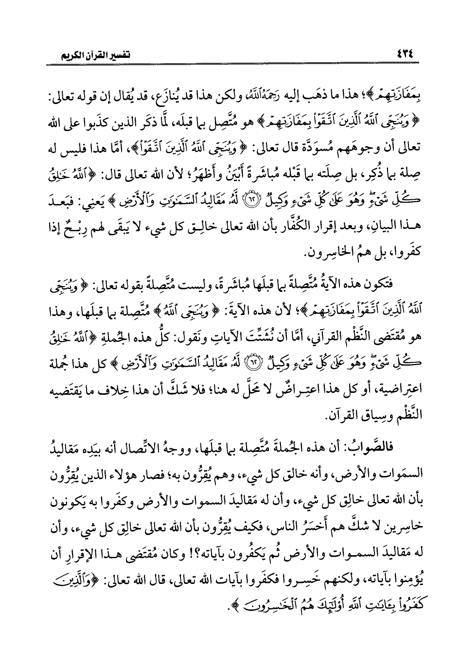 بِمَفَازَتِهِمْ}؛ هذا ما ذهَب إليه رَحِمَهُ اللهُ، ولكن هذا قد يُنازَع، قد يُقال إن قوله تعالى: {وَيُنَجِّي اللَّهُ الَّذِينَ اتَّقَوْا بِمَفَازَتِهِمْ} هو مُتَّصِل بما قبلَه، لمَّا ذكَر الذين كذَبوا على الله تعالى أن وجوهَهم مُسوَدَّة قال تعالى: {وَيُنَجِّي اللَّهُ الَّذِينَ اتَّقَوْا}، أمَّا هذا فليس له صِلة بما ذُكِر، بل صِلَته بما قَبْله مُباشَرةً أَبْيَنُ وأَظهَرُ؛ لأن الله تعالى قال: {اللَّهُ خَالِقُ كُلِّ شَيْءٍ وَهُوَ عَلَى كُلِّ شَيْءٍ وَكِيلٌ (٦٢) لَهُ مَقَالِيدُ السَّمَاوَاتِ وَالْأَرْضِ} يَعنِي: فبَعدَ هذا البيانِ، وبعد إقرار الكُفَّار بأن الله تعالى خالِق كل شيء لا يَبقَى لهم رِبْحٌ إذا كفَروا، بل همُ الخاسِرون.