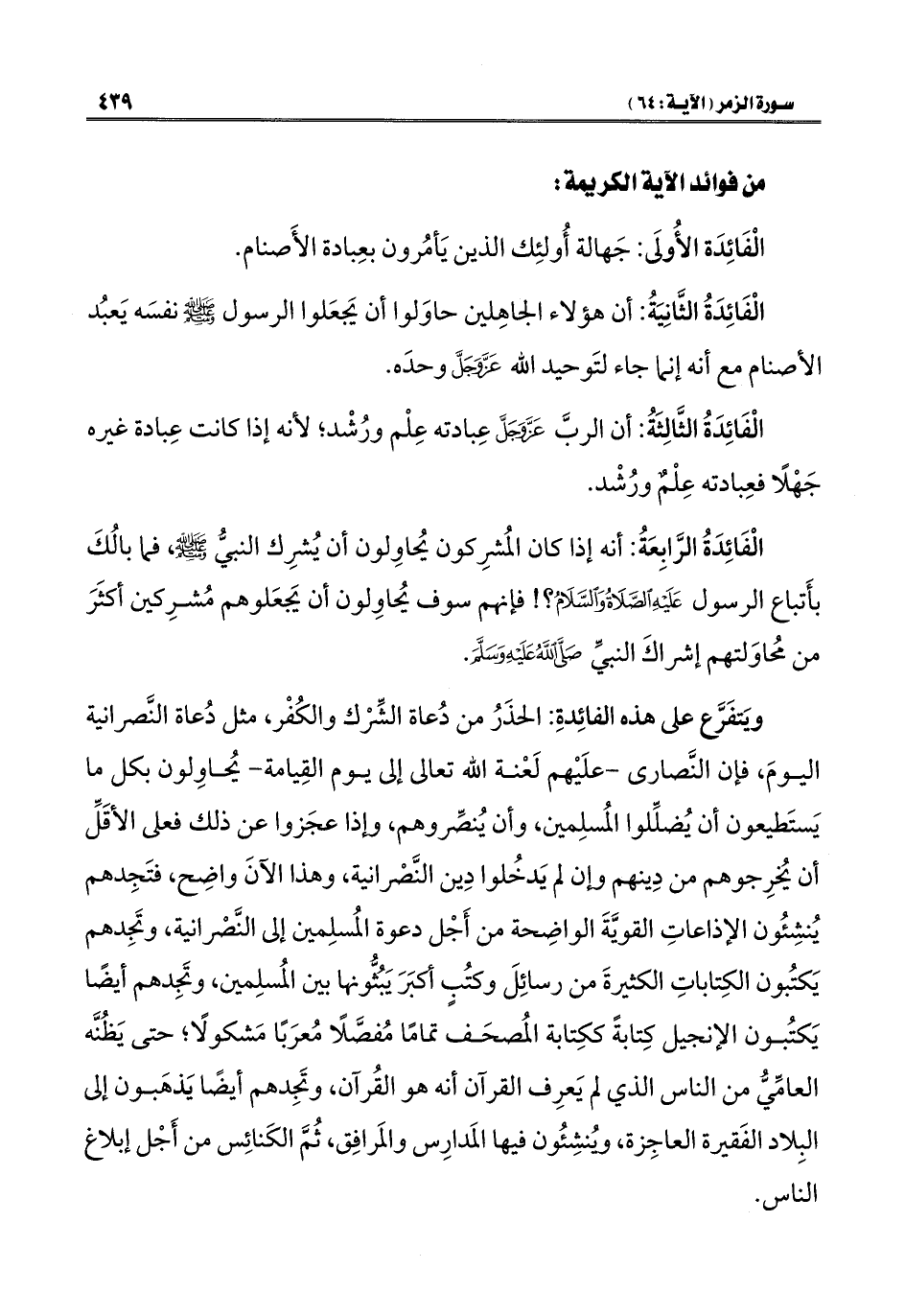 ويَتفَرَّع على هذه الفائِدةِ: الحذَرُ من دُعاة الشِّرْك والكُفْر، مثل دُعاة النَّصرانية اليومَ، فإن النَّصارى - علَيْهم لَعْنة الله تعالى إلى يوم القِيامة - يُحاوِلون بكل ما يَستَطيعون أن يُضلِّلوا المُسلِمين، وأن يُنصِّروهم، وإذا عجَزوا عن ذلك فعلى الأقَلِّ أن يُخرِجوهم من دِينهم وإن لم يَدخُلوا دِين النَّصْرانية، وهذا الآنَ واضِح، فتَجِدهم يُنشِئُون الإذاعاتِ القويَّةَ الواضِحة من أَجْل دعوة المُسلِمين إلى النَّصْرانية، وتَجِدهم يَكتُبون الكِتاباتِ الكثيرةَ من رسائِلَ وكتُبٍ أكبَرَ يَبُثُّونها بين المُسلِمين، وتَجِدهم أيضًا يَكتُبون الإنجيل كِتابةً ككِتابة المُصحَف تمامًا مُفصَّلًا مُعرَبًا مَشكولًا؛ حتى يَظُنَّه العامِّيُّ من الناس الذي لم يَعرِف القرآن أنه هو القُرآن، وتَجِدهم أيضًا يَذهَبون إلى البِلاد الفَقيرة العاجِزة، ويُنشِئُون فيها المَدارِس والمَرافِق، ثُمَّ الكَنائِس من أَجْل إبلاغ الناس.