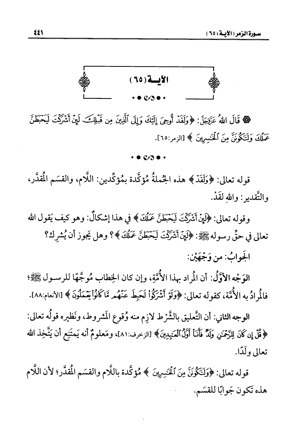 وقوله تعالى: {لَئِنْ أَشْرَكْتَ لَيَحْبَطَنَّ عَمَلُكَ} في هذا إشكالٌ: وهو كيف يَقول الله تعالى في حقِّ رسوله - صلى الله عليه وسلم -: {لَئِنْ أَشْرَكْتَ لَيَحْبَطَنَّ عَمَلُكَ}؟ وهل يَجوز أن يُشرِك؟