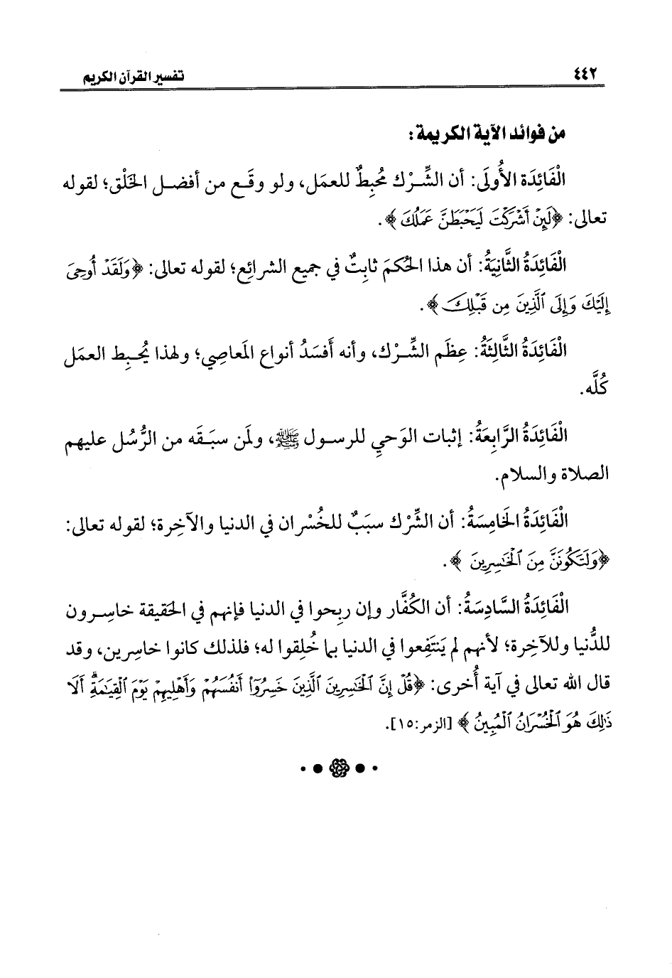 الْفَائِدَةُ الخَامِسَةُ: أن الشِّرْك سبَبٌ للخُسْران في الدنيا والآخِرة؛ لقوله تعالى: {وَلَتَكُونَنَّ مِنَ الْخَاسِرِينَ}.