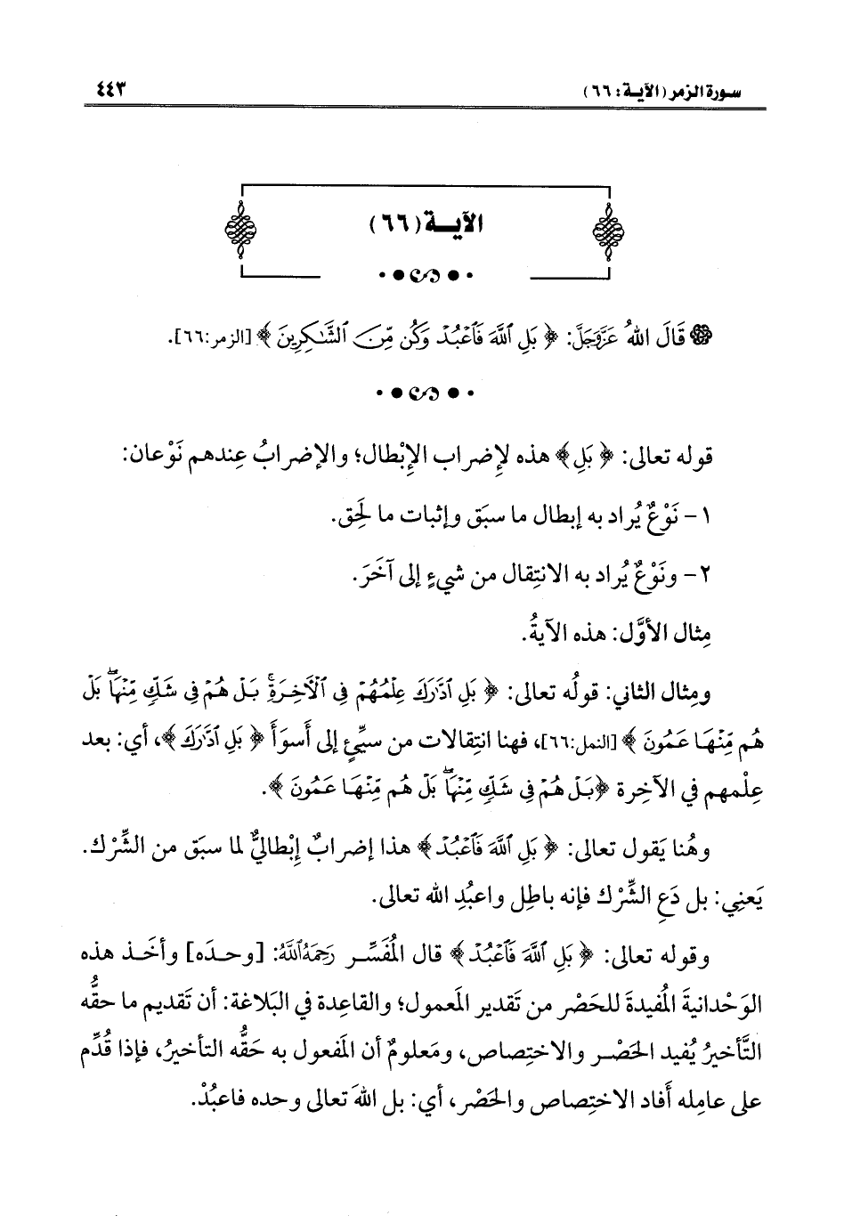 وقوله تعالى: {بَلِ اللَّهَ فَاعْبُدْ} قال المُفَسِّر رَحِمَهُ اللهُ: [وحدَه] وأخَذ هذه الوَحْدانيةَ المُفيدةَ للحَصْر من تَقدير المَعمول؛ والقاعِدة في البَلاغة: أن تَقديم ما حقُّه التَّأخيرُ يُفيد الحَصْر والاختِصاص، ومَعلومٌ أن المَفعول به حَقُّه التأخيرُ، فإذا قُدِّم على عامِله أَفاد الاختِصاص والحَصْر، أي: بل اللهَ تعالى وحده فاعبُدْ.