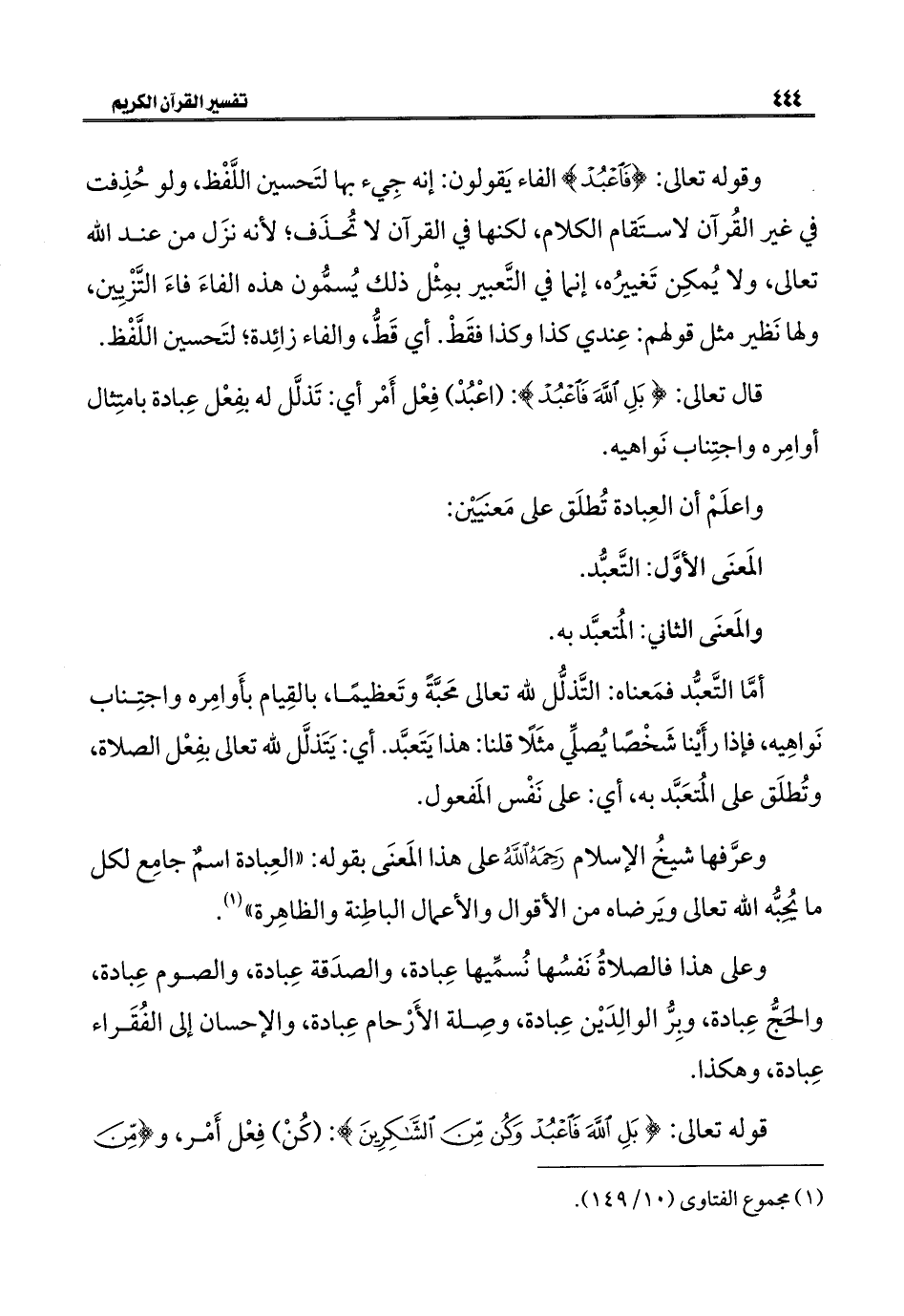 قال تعالى: {بَلِ اللَّهَ فَاعْبُدْ}: (اعْبُدْ) فِعْل أَمْر أي: تَذلَّل له بفِعْل عِبادة بامتِثال أوامِره واجتِناب نَواهيه.