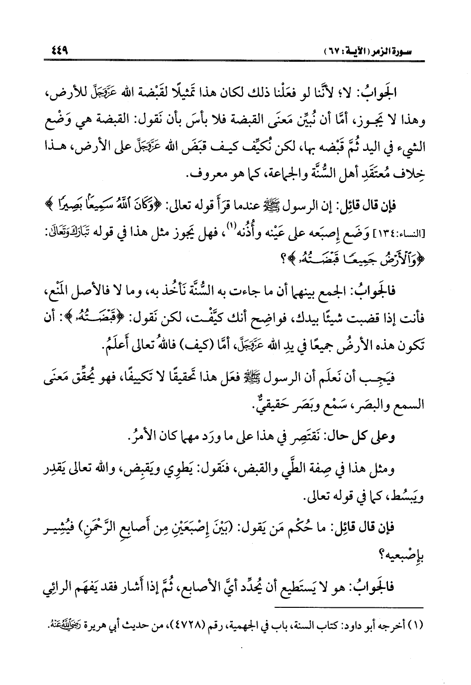 فالجَوابُ: الجمع بينهما أن ما جاءت به السُّنَّة نَأخُذ به، وما لا فالأصل المَنْع، فأنت إذا قبضت شيئًا بيدك، فواضِح أنك كيَّفْت، لكن نَقول: {قَبْضَتُهُ}: أن تَكون هذه الأرضُ جميعًا في يدِ الله عَزَّ وَجَلَّ، أمَّا (كيف) فاللهُ تعالى أَعلَمُ.