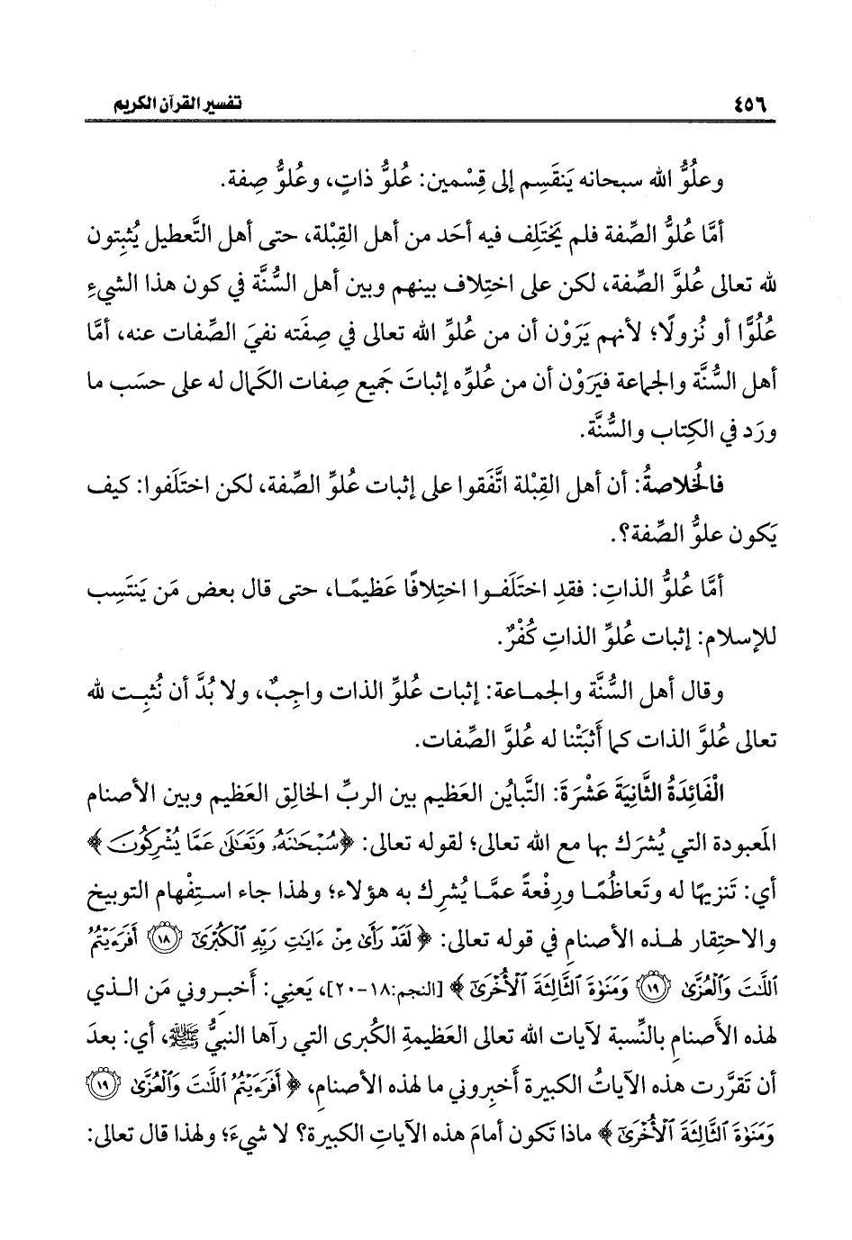 الْفَائِدَةُ الثَّانِيَةَ عَشْرَةَ: التَّبايُن العَظيم بين الربِّ الخالِق العَظيم وبين الأصنام المَعبودة التي يُشرَك بها مع الله تعالى؛ لقوله تعالى: {سُبْحَانَهُ وَتَعَالَى عَمَّا يُشْرِكُونَ} أي: تَنزيهًا له وتَعاظُمًا ورِفْعةً عمَّا يُشرِك به هؤلاء؛ ولهذا جاء استِفْهام التوبيخ والاحتِقار لهذه الأصنامِ في قوله تعالى: {لَقَدْ رَأَى مِنْ آيَاتِ رَبِّهِ الْكُبْرَى (١٨) أَفَرَأَيْتُمُ اللَّاتَ وَالْعُزَّى (١٩) وَمَنَاةَ الثَّالِثَةَ الْأُخْرَى} [النجم: ١٨ - ٢٠]، يَعنِي: أَخبروني مَن الذي لهذه الأَصنامِ بالنِّسبة لآيات الله تعالى العَظيمةِ الكُبرى التي رآها النبيُّ - صلى الله عليه وسلم -، أي: بعدَ أن تَقرَّرت هذه الآياتُ الكبيرة أَخبِروني ما لهذه الأصنامِ، {أَفَرَأَيْتُمُ اللَّاتَ وَالْعُزَّى (١٩) وَمَنَاةَ الثَّالِثَةَ الْأُخْرَى} ماذا تَكون أمامَ هذه الآياتِ الكبيرة؟ لا شيءَ؛ ولهذا قال تعالى: