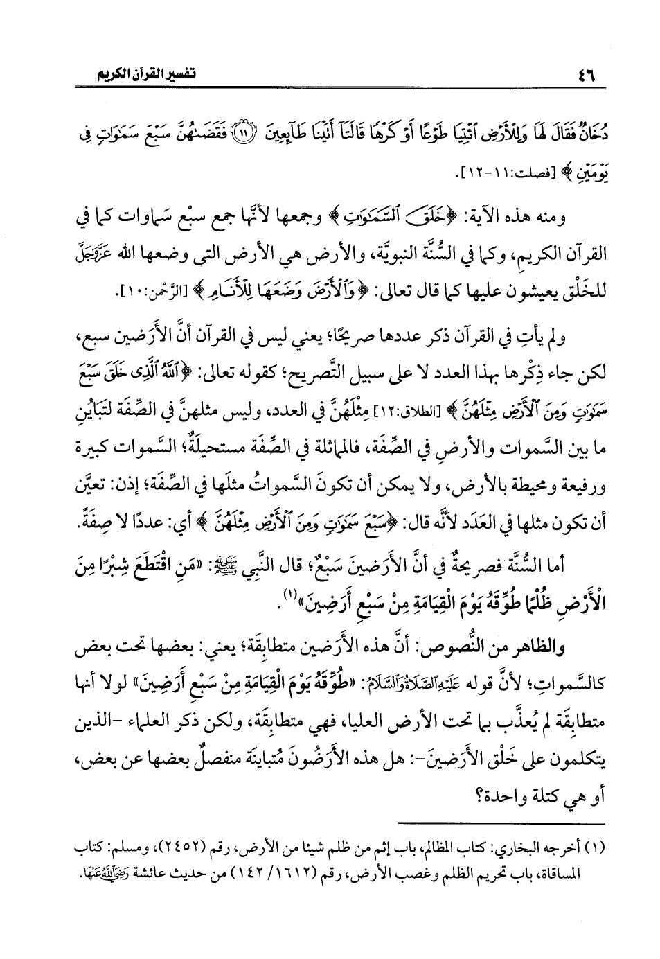 والظاهر من النُّصوص: أنَّ هذه الأَرَضين متطابِقَة؛ يعني: بعضها تحت بعض كالسَّمواتِ؛ لأنَّ قوله عَلَيْهِ الصَّلَاةُ وَالسَّلَامُ: "طُوِّقَهُ يَوْمَ الْقِيَامَةِ مِنْ سَبْعِ أَرَضِينَ" لولا أنها متطابِقَة لم يُعذَّب بما تحت الأرض العليا، فهي متطابِقَة، ولكن ذكر العلماء - الذين يتكلمون على خَلْق الأَرَضينَ -: هل هذه الأَرَضُونَ مُتباينَة منفصلٌ بعضها عن بعض، أو هي كتلة واحدة؟