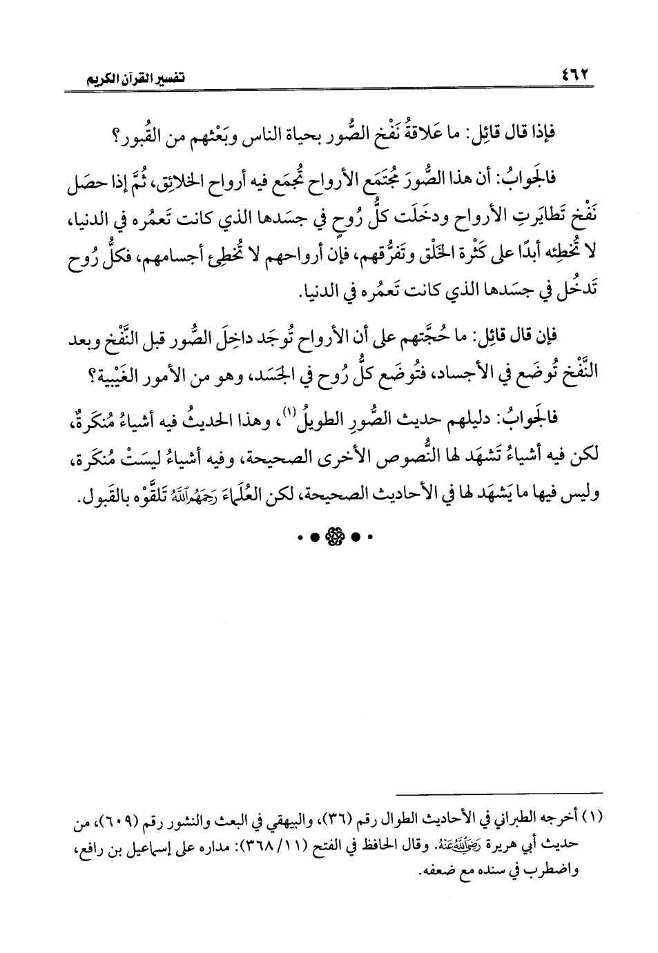 فالجَوابُ: أن هذا الصُّورَ مُجتَمَع الأرواح تُجمَع فيه أرواح الخلائِق، ثُمَّ إذا حصَل نَفْخ تَطايَرتِ الأرواح ودخَلَت كلُّ رُوحٍ في جسَدها الذي كانت تَعمُره في الدنيا، لا تُخطِئه أبدًا على كَثْرة الخَلْق وتَفرُّقهم، فإن أرواحهم لا تُخطِئ أجسامهم، فكلُّ رُوح تَدخُل في جسَدها الذي كانت تَعمُره في الدنيا.