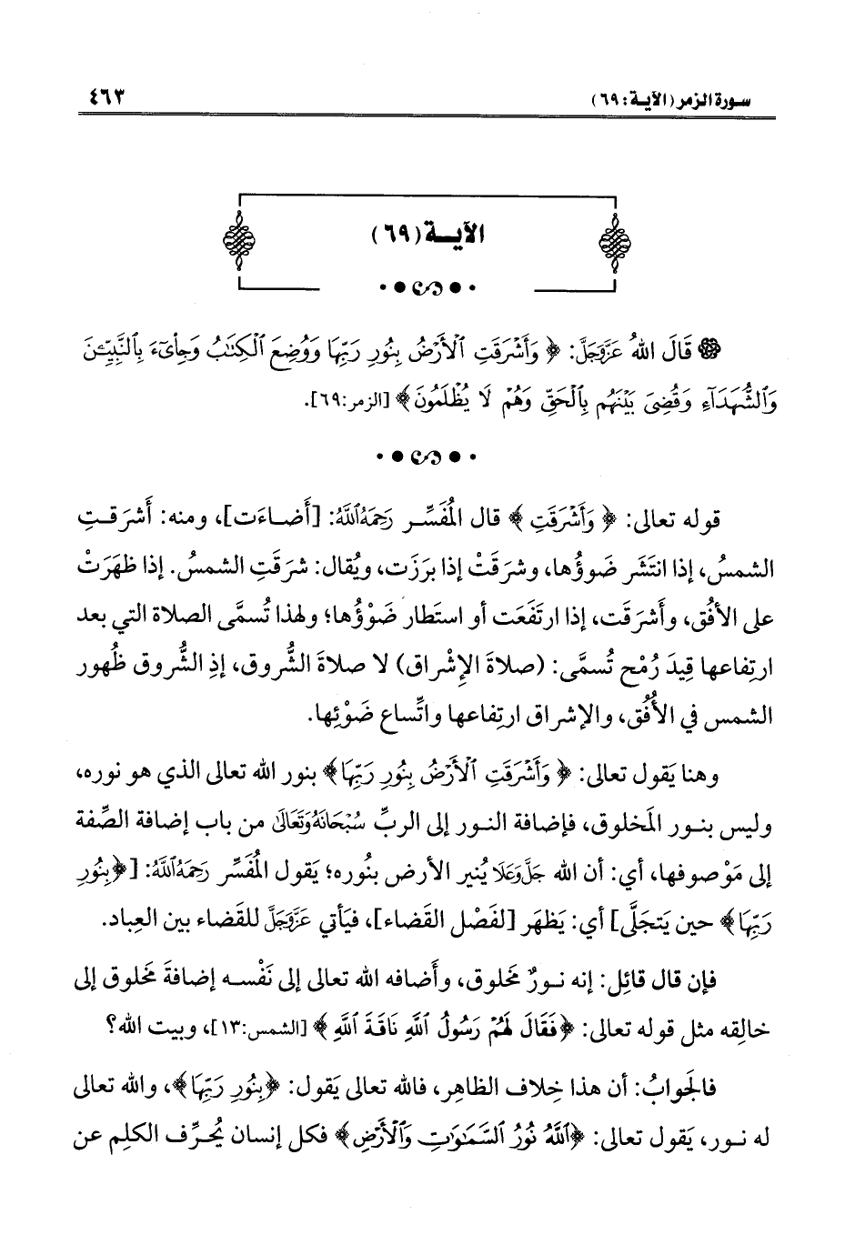 وهنا يَقول تعالى: {وَأَشْرَقَتِ الْأَرْضُ بِنُورِ رَبِّهَا} بنور الله تعالى الذي هو نوره، وليس بنور المَخلوق، فإضافة النور إلى الربِّ سُبْحَانَهُ وَتَعَالَى من باب إضافة الصِّفة إلى مَوْصوفها، أي: أن الله جَلَّ وَعَلَا يُنير الأرض بنُوره؛ يَقول المُفَسِّر رَحِمَهُ اللهُ: [{بِنُورِ رَبِّهَا} حين يَتجَلَّى] أي: يَظهَر [لفَصْل القَضاء]، فيَأتي عَزَّ وَجَلَّ للقَضاء بين العِباد.