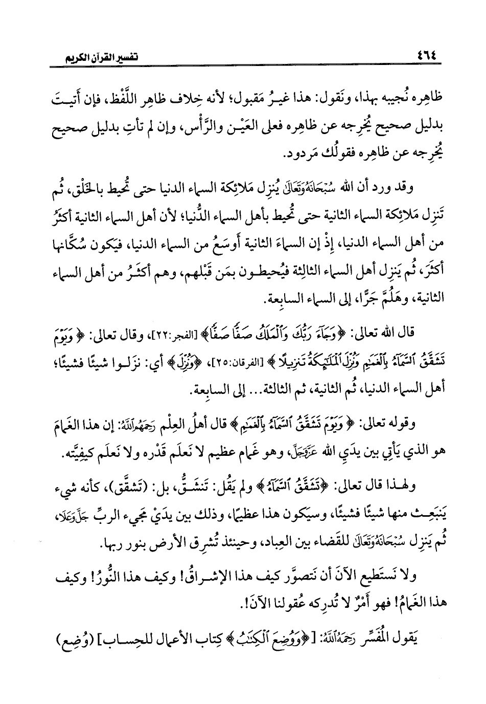 ولهذا قال تعالى: {تَشَقَّقُ السَّمَاءُ} ولم يَقُل: تَنشَقُّ، بل: (تَشقَّق)، كأنه شيء يَنبَعِث منها شيئًا فشيئًا، وسيَكون هذا عظيمًا، وذلك بين يدَيْ مَجيء الربِّ جَلَّ وَعَلَا، ثُم يَنزِل سُبْحَانَهُ وَتَعَالَى للقَضاء بين العِباد، وحينئذ تُشرِق الأرض بنور ربها.