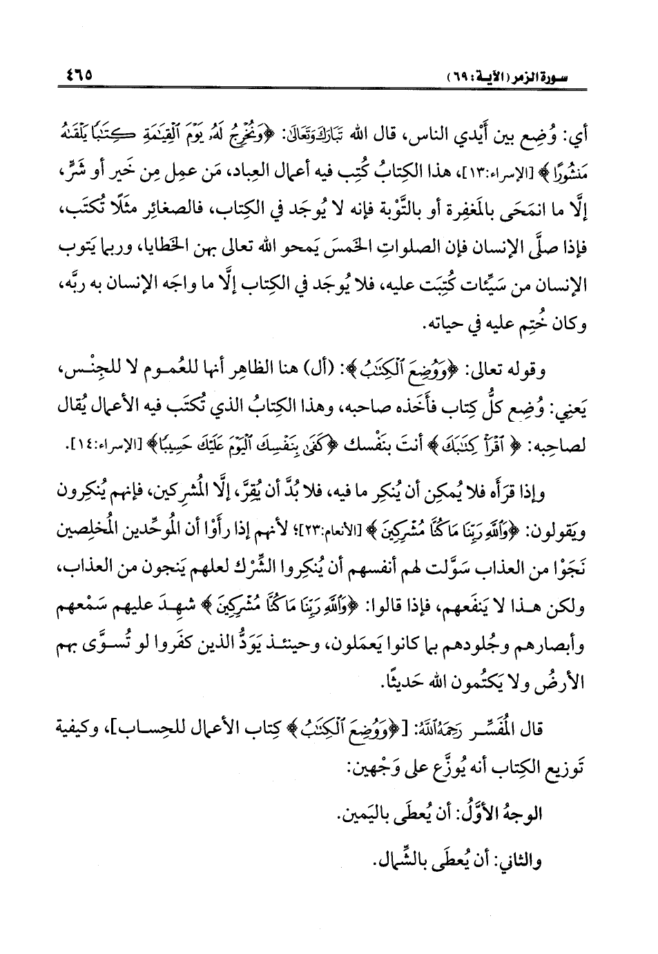 قال المُفَسِّر رَحِمَهُ اللهُ: [{وَوُضِعَ الْكِتَابُ} كِتاب الأعمال للحِساب]، وكيفية تَوزيع الكِتاب أنه يُوزَّع على وَجْهين: