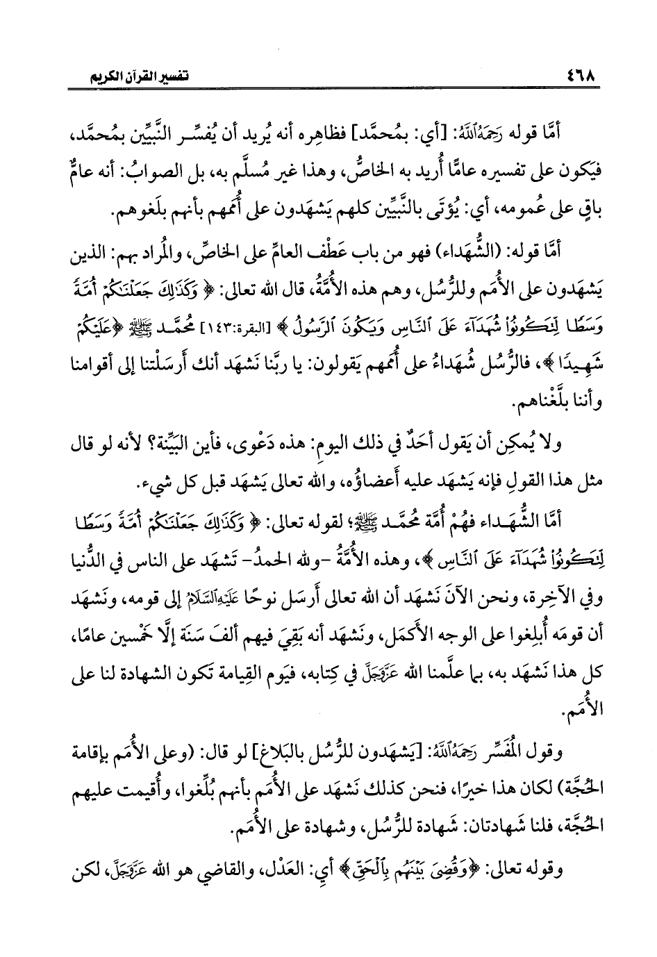 وقول المُفَسِّر رَحِمَهُ اللهُ: [يَشهَدون للرُّسُل بالبَلاغ] لو قال: (وعلى الأُمَم بإقامة الحُجَّة) لكان هذا خيرًا، فنحن كذلك نَشهَد على الأُمَم بأنهم بُلِّغوا، وأُقيمت عليهم الحُجَّة، فلنا شَهادتان: شَهادة للرُّسُل، وشهادة على الأُمَم.