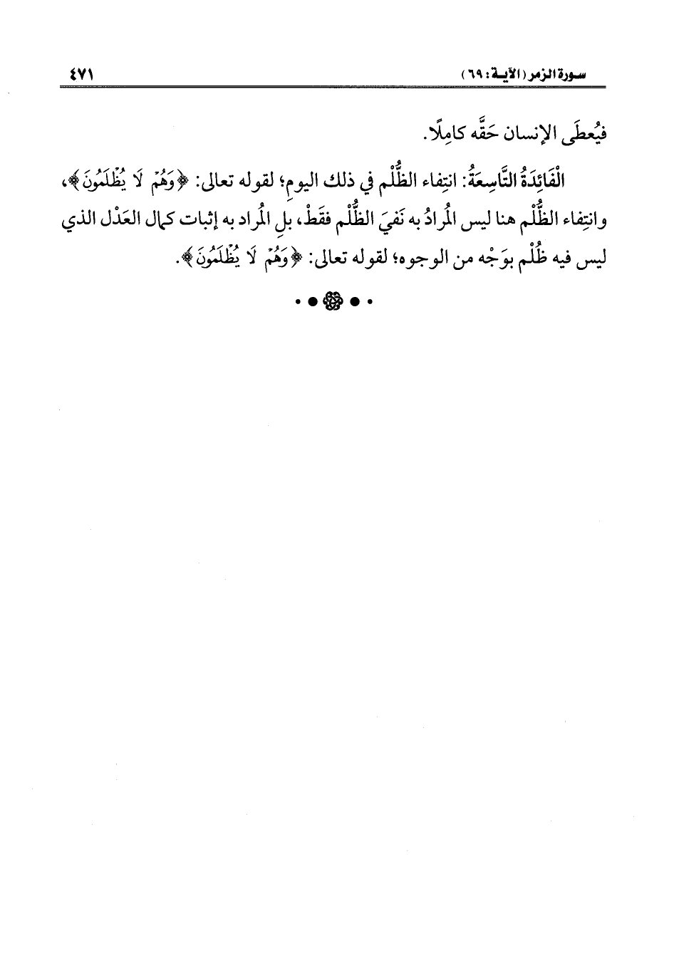 الْفَائِدَةُ التَّاسِعَةُ: انتِفاء الظُّلْم في ذلك اليومِ؛ لقوله تعالى: {وَهُمْ لَا يُظْلَمُونَ}، وانتِفاء الظُّلْم هنا ليس المُرادُ به نَفيَ الظُّلْم فقَطْ، بلِ المُراد به إثبات كمال العَدْل الذي ليس فيه ظُلْم بوَجْه من الوجوه؛ لقوله تعالى: {وَهُمْ لَا يُظْلَمُونَ}.