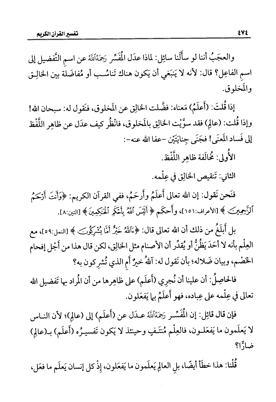 والعجَبُ أننا لو سأَلَنا سائِل: لماذا عدَل المُفَسِّر رَحِمَهُ اللهُ عن اسمِ التَّفضيل إلى اسمِ الفاعِل؟ قال: لأنه لا يَنبَغي أن يَكون هناك تَناسُب أو مُفاضَلة بين الخالِق والمَخلوق.