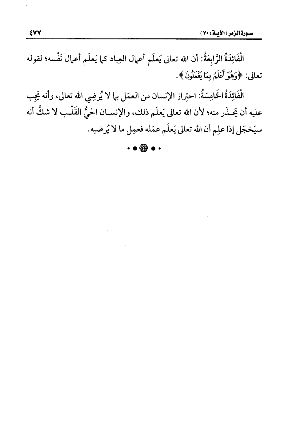 الْفَائِدَةُ الخَامِسَةُ: احتِراز الإنسان من العمَل بما لا يُرضِي الله تعالى، وأنه يَجِب عليه أن يَحذَر منه؛ لأن الله تعالى يَعلَم ذلك، والإنسان الحيُّ القَلْب لا شكَّ أنه سيَخجَل إذا علِم أن الله تعالى يَعلَم عمَله فعمِل ما لا يُرضيه.