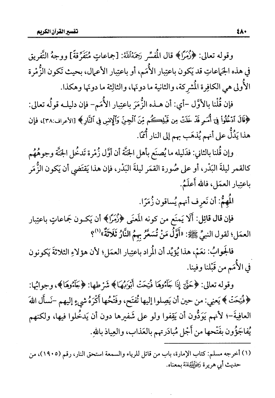 فإن قال قائِل: أَلَا يَمنَع من كونه المَعنَى {زُمَرًا} أن يَكون جَماعاتٍ باعتِبار العمَل؛ لقول النبيِّ - صلى الله عليه وسلم -: "أَوَّلُ مَنْ تُسَعَّرُ بِهِمُ النَّارُ ثَلَاثَةٌ" (١)؟