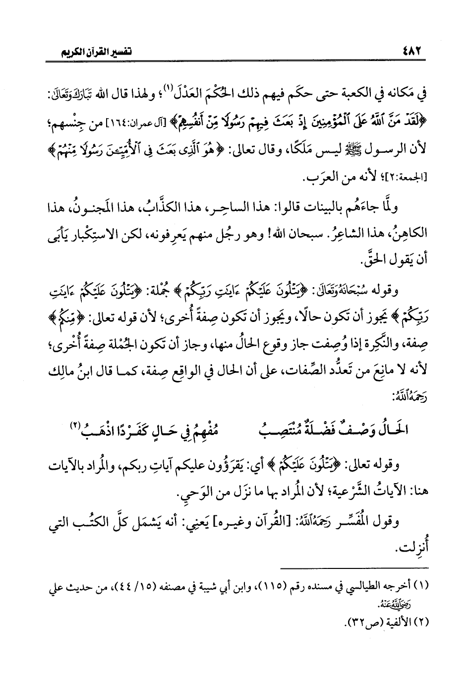 وقوله سُبْحَانَهُ وَتَعَالَى: {يَتْلُونَ عَلَيْكُمْ آيَاتِ رَبِّكُمْ} جُمْلة: {يَتْلُونَ عَلَيْكُمْ آيَاتِ رَبِّكُمْ} يَجوز أن تَكون حالًا، ويَجوز أن تَكون صِفةً أُخرى؛ لأن قوله تعالى: {مِنْكُمْ} صِفة، والنَّكِرة إذا وُصِفت جاز وقوع الحالُ منها، وجاز أن تَكون الجُمْلة صِفةً أُخْرى؛ لأنه لا مانِعَ من تَعدُّد الصِّفات، على أن الحال في الواقِع صِفة، كما قال ابنُ مالِك رَحِمَهُ اللهُ: