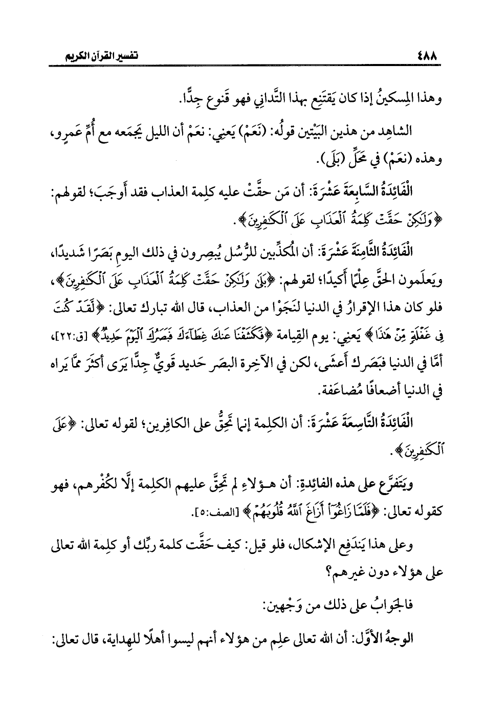 الْفَائِدَةُ التَّاسِعَةَ عَشْرَةَ: أن الكلِمة إنما تَحِقُّ على الكافِرين؛ لقوله تعالى: {عَلَى الْكَافِرِينَ}.