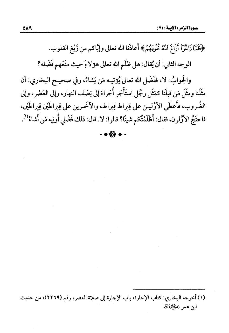 والجَوابُ: لا، ففَضْل الله تعالى يُؤتيه مَن يَشاءُ، وفي صحيح البخاري: أن مثَلَنا ومثَلَ مَن قبلَنا كمَثَل رجُل استَأْجَر أُجَراءَ إلى نِصْف النهار، وإلى العَصْر، وإلى الغُروب، فأَعطَى الأوَّلين على قِيراط قِيراط، والآخَرين على قِيراطَيْن قِيراطَيْن، فاحتَجَّ الأوَّلون، فقال: أَظَلَمْتُكم شيئًا؟ قالوا: لا. قال: ذلك فَضْلي أُوتِيه مَن أَشاءُ (١).