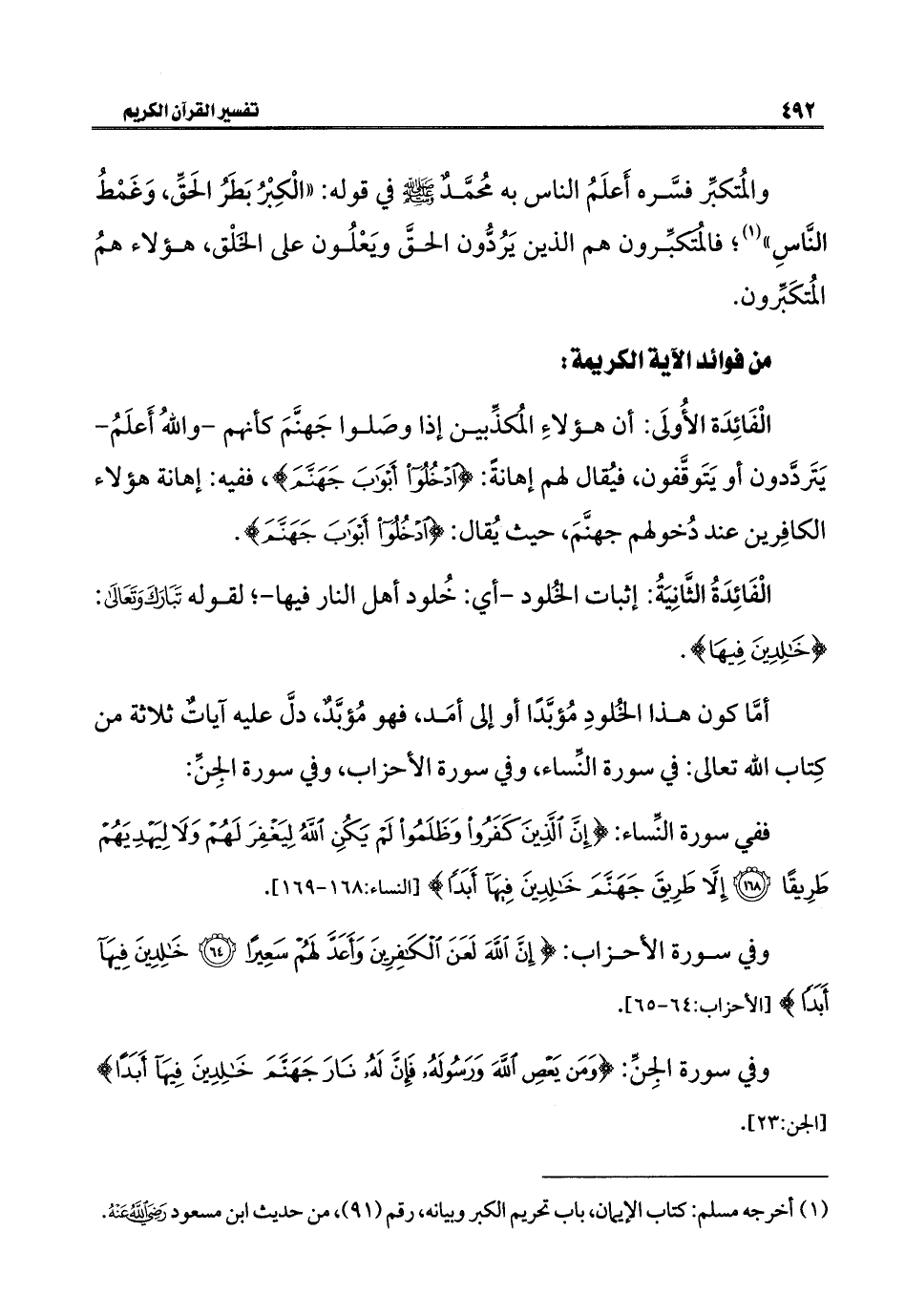 والمُتكبِّر فسَّره أَعلَمُ الناس به مُحمَّدٌ - صلى الله عليه وسلم - في قوله: "الْكِبْرُ بَطَرُ الحَقِّ، وَغَمْطُ النَّاسِ" (١)؛ فالمُتكبِّرون هم الذين يَرُدُّون الحقَّ ويَعْلُون على الخَلْق، هؤلاء همُ المُتكَبِّرون.