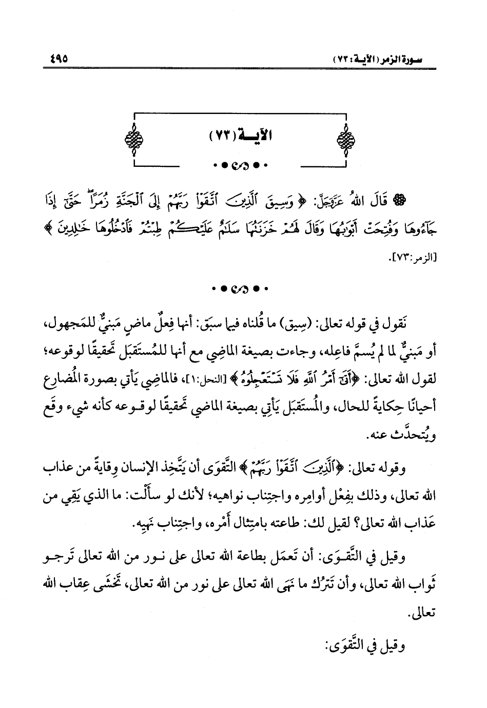 نَقول في قوله تعالى: (سِيق) ما قُلناه فيما سبَق: أنها فِعلٌ ماضٍ مَبنيٌّ للمَجهول، أو مَبنيٌّ لما لم يُسمَّ فاعِله، وجاءت بصيغة الماضِي مع أنها للمُستَقبَل تَحقيقًا لوقوعه؛ لقول الله تعالى: {أَتَى أَمْرُ اللَّهِ فَلَا تَسْتَعْجِلُوهُ} [النحل: ١]، فالماضِي يَأتي بصورة المُضارِع أحيانًا حِكايةً للحال، والمُستَقبَل يَأتِي بصيغة الماضي تَحقيقًا لوقوعه كأنه شيء وقَع ويُتحدَّث عنه.