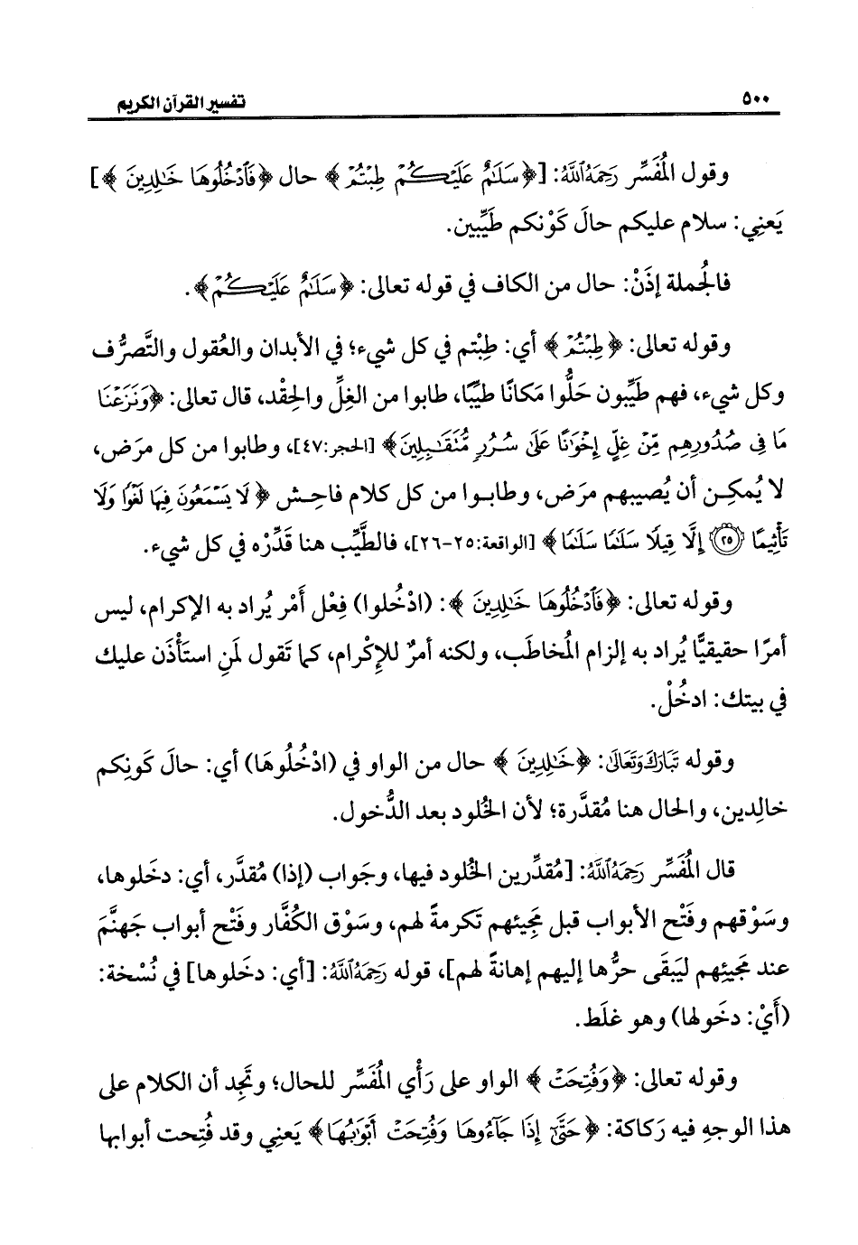 وقول المُفَسِّر رَحِمَهُ اللهُ: [{سَلَامٌ عَلَيْكُمْ طِبْتُمْ} حال {فَادْخُلُوهَا خَالِدِينَ}] يَعنِي: سلام عليكم حالَ كَوْنكم طَيِّبين.