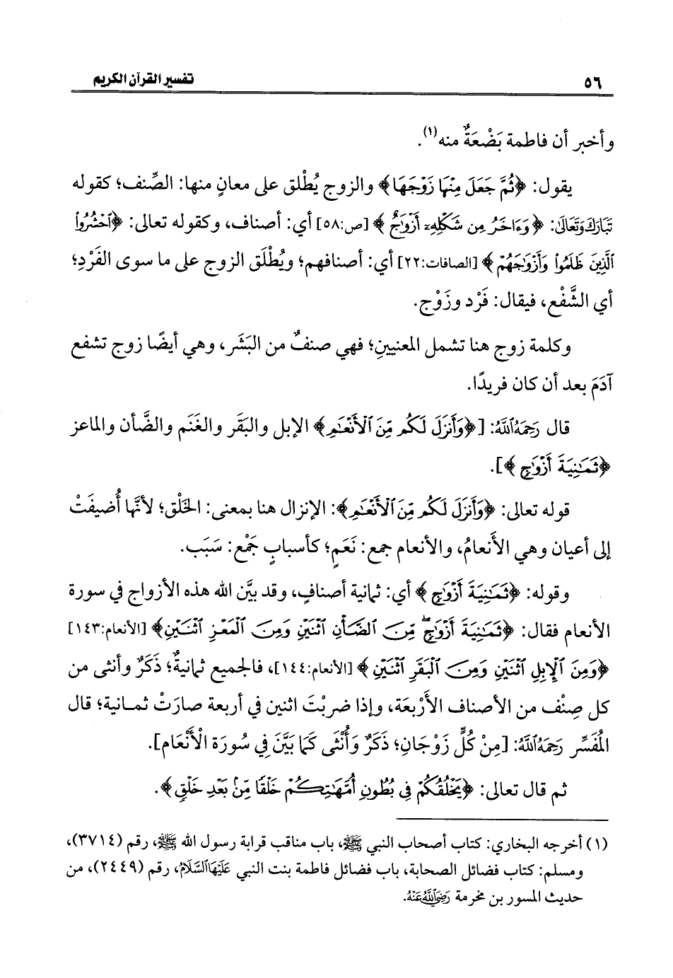 يقول: {ثُمَّ جَعَلَ مِنْهَا زَوْجَهَا} والزوج يُطْلق على معانٍ منها: الصِّنف؛ كقوله تَبَارَكَ وَتَعَالَى: {وَآخَرُ مِنْ شَكْلِهِ أَزْوَاجٌ} [ص: ٥٨] أي: أصناف، وكقوله تعالى: {احْشُرُوا الَّذِينَ ظَلَمُوا وَأَزْوَاجَهُمْ} [الصافات: ٢٢] أي: أصنافهم؛ ويُطْلَق الزوج على ما سوى الفَرْدِ؛ أي الشَّفْع، فيقال: فَرْد وزَوْج.