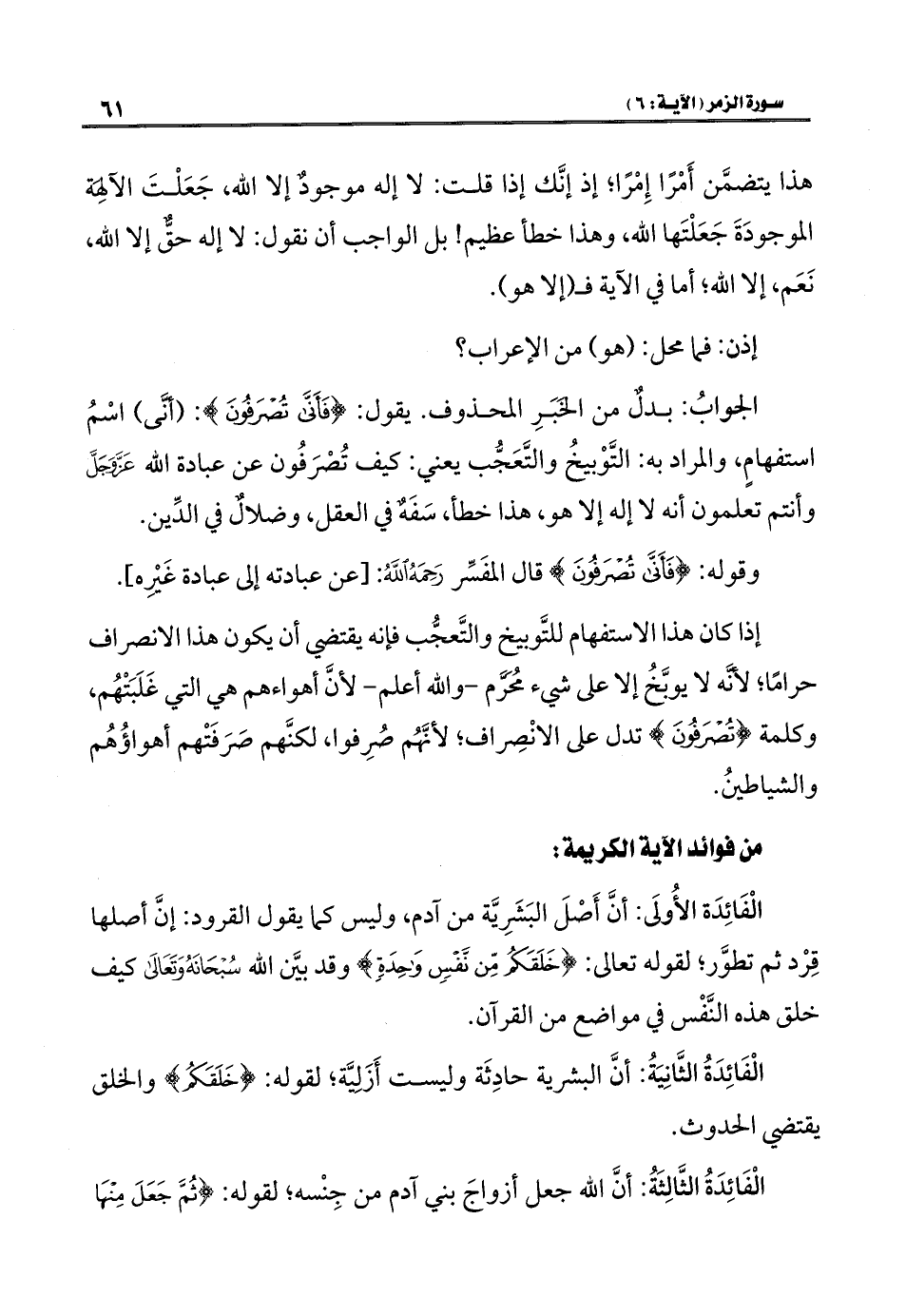 الجوابُ: بدلٌ من الخَبَرِ المحذوف. يقول: {فَأَنَّى تُصْرَفُونَ}: (أنَّى) اسْمُ استفهامٍ، والمراد به: التَّوْبيخُ والتَّعَجُّب يعني: كيف تُصْرَفُون عن عبادة الله عَزَّ وَجَلَّ وأنتم تعلمون أنه لا إله إلا هو، هذا خطأ، سَفَهٌ في العقل، وضلالٌ في الدِّين.