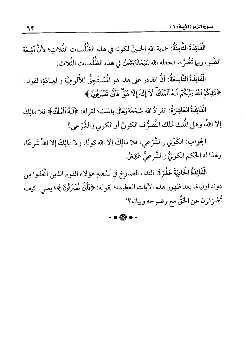 الْفَائِدَةُ التَّاسِعَةُ: أنَّ القادر على هذا هو المُسْتَحِقُّ للأُلوهِيَّة والعِبادَةِ؛ لقوله: {ذَلِكُمُ اللَّهُ رَبُّكُمْ لَهُ الْمُلْكُ لَا إِلَهَ إِلَّا هُوَ فَأَنَّى تُصْرَفُونَ}.