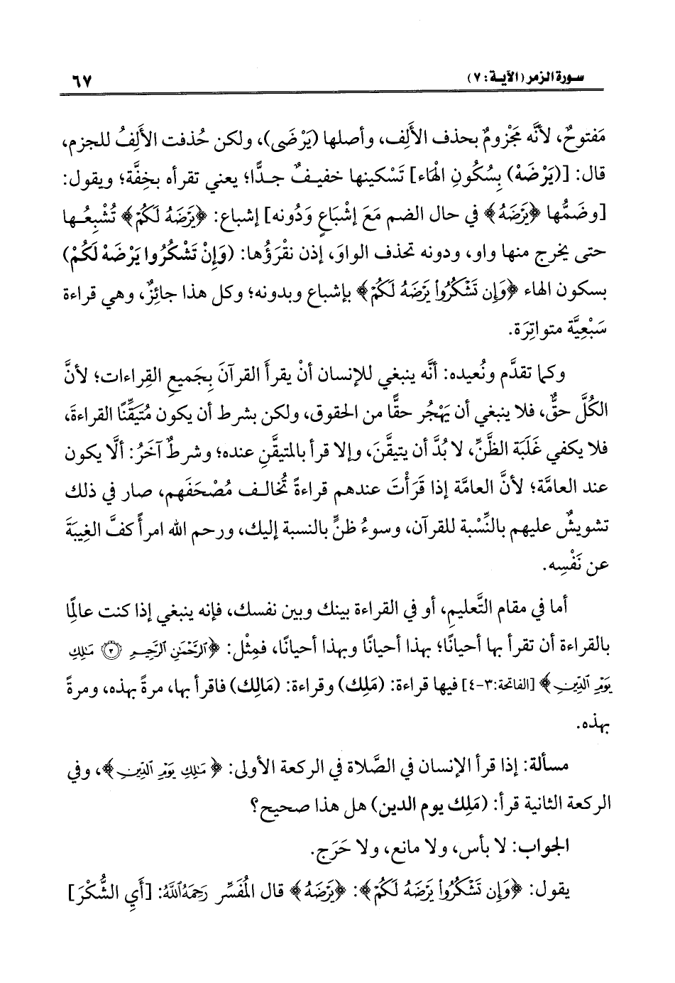 وكما تقدَّم ونُعيده: أنَّه ينبغي للإنسان أنْ يقرأَ القرآنَ بِجَميعِ القِراءات؛ لأنَّ الكُلَّ حقٌّ، فلا ينبغي أن يَهْجُر حقًّا من الحقوق، ولكن بشرط أن يكون مُتيقِّنًا القراءةَ، فلا يكفي غَلَبَة الظَّنِّ، لا بُدَّ أن يتيقَّنَ، وإلا قرأ بالمتيقَّنِ عنده؛ وشرطٌ آخَرُ: ألَّا يكون عند العامَّة؛ لأنَّ العامَّة إذا قَرَأْتَ عندهم قراءةً تُخالف مُصحَفَهم، صار في ذلك تشويشٌ عليهم بالنِّسْبة للقرآن، وسوءُ ظنٍّ بالنسبة إليك، ورحم الله امرأً كفَّ الغِيبَةَ عن نَفْسِه.