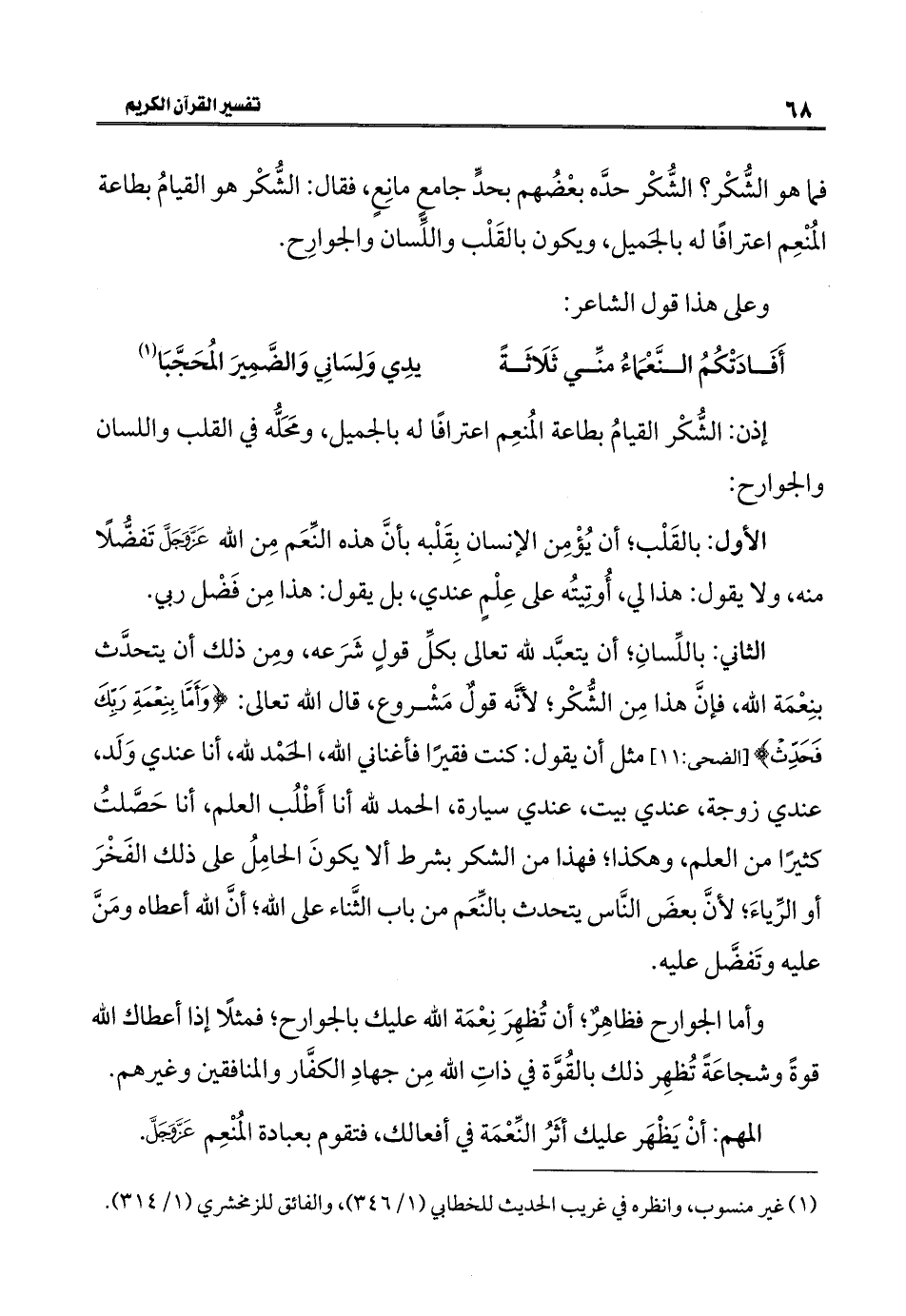 الثاني: باللِّسانِ؛ أن يتعبَّد لله تعالى بكلِّ قولٍ شَرَعه، ومن ذلك أن يتحدَّث بنِعْمَة الله، فإنَّ هذا مِن الشُّكْر؛ لأنَّه قول مَشْروع، قال الله تعالى: {وَأَمَّا بِنِعْمَةِ رَبِّكَ فَحَدِّثْ} [الضحى: ١١] مثل أن يقول: كنت فقيرًا فأغناني الله، الحَمْد لله، أنا عندي وَلَد، عندي زوجة، عندي بيت، عندي سيارة، الحمد لله أنا أَطْلُب العلم، أنا حَصَّلتُ كثيرًا من العلم، وهكذا؛ فهذا من الشكر بشرط ألا يكونَ الحامِلُ على ذلك الفَخْرَ أو الرِّياءَ؛ لأنَّ بعضَ النَّاس يتحدث بالنِّعَم من باب الثَّناء على الله؛ أنَّ الله أعطاه ومَنَّ عليه وتَفضَّل عليه.