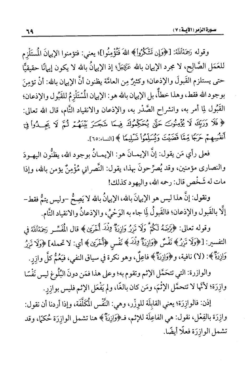 وقوله تعالى: {يَرْضَهُ لَكُمْ وَلَا تَزِرُ وَازِرَةٌ وِزْرَ أُخْرَى} قال المُفَسِّر رَحِمَهُ اللهُ في التفسير: [{وَلَا تَزِرُ} نَفْسٌ {وَازِرَةٌ وِزْرَ} نَفْسٍ {أُخْرَى} أي: لا تحمله] {وَلَا تَزِرُ وَازِرَةٌ}: (لا) نافية، و {وَازِرَةٌ} فاعِلٌ، وهو نكرة في سياق النفي، فيَعُمُّ كلَّ وازِرٍ.