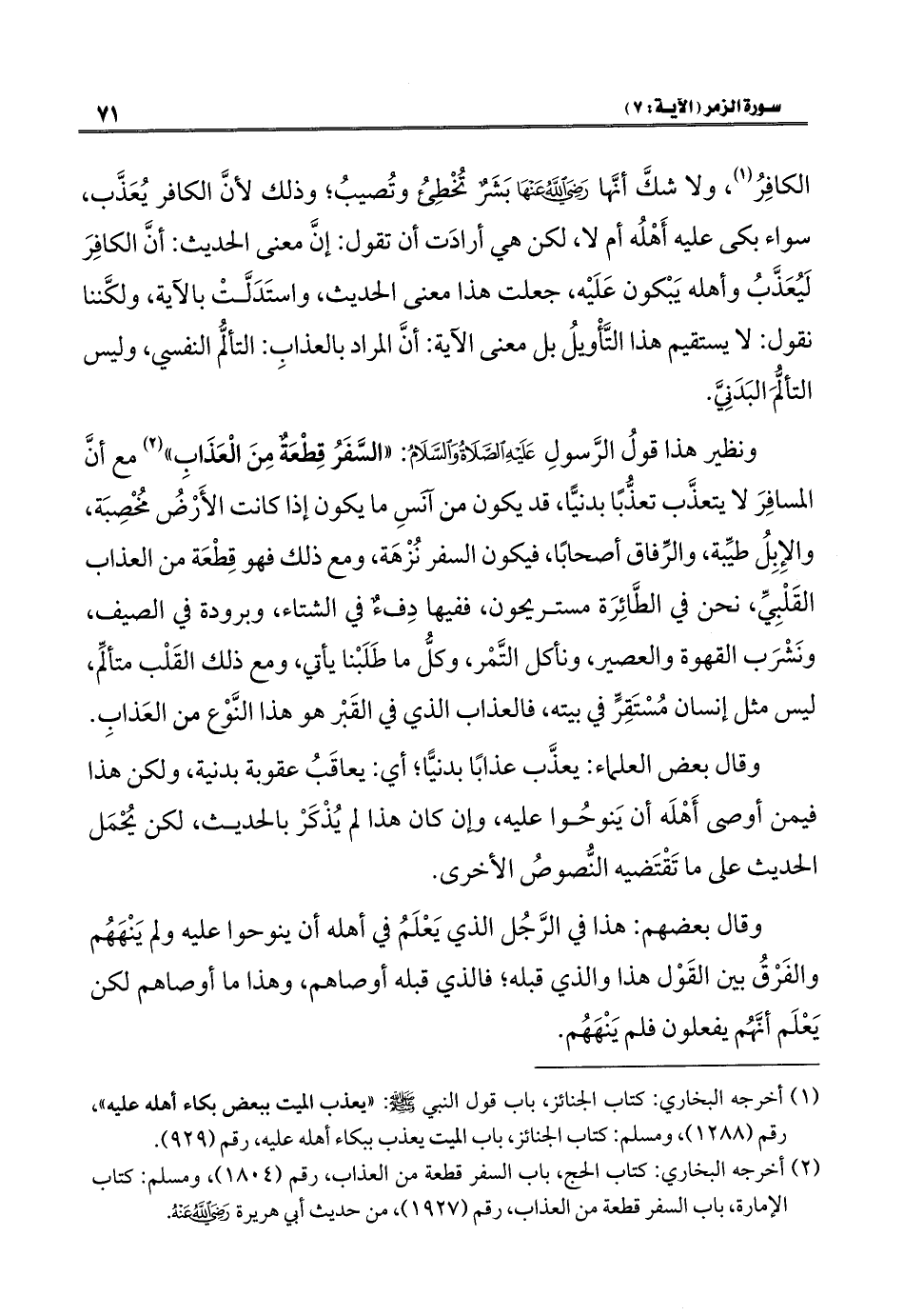 ونظير هذا قولُ الرَّسولِ عَلَيْهِ الصَّلَاةُ وَالسَّلَامُ: "السَّفَرُ قِطْعَةٌ مِنَ الْعَذَابِ" (٢) مع أنَّ المسافِرَ لا يتعذَّب تعذُّبًا بدنيًّا، قد يكون من آنَسِ ما يكون إذا كانت الأَرْضُ مُخْصِبَة، والإِبِلُ طيِّبة، والرِّفاق أصحابًا، فيكون السفر نُزْهَة، ومع ذلك فهو قِطْعَة من العذاب القَلْبِيِّ، نحن في الطَّائِرَة مستريحون، ففيها دِفءٌ في الشتاء، وبرودة في الصيف، ونَشْرَب القهوة والعصير، ونأكل التَّمْر، وكلُّ ما طَلَبْنا يأتي، ومع ذلك القَلْب متألِّم، ليس مثل إنسان مُسْتَقِرٍّ في بيته، فالعذاب الذي في القَبْر هو هذا النَّوْع من العَذابِ.