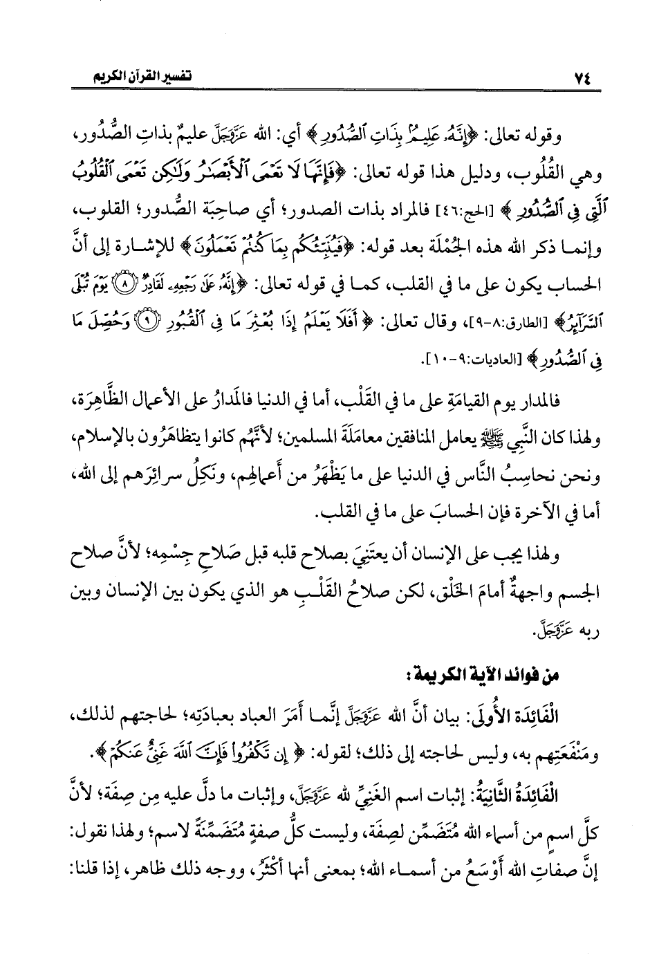 وقوله تعالى: {إِنَّهُ عَلِيمٌ بِذَاتِ الصُّدُورِ} أي: الله عَزَّ وَجَلَّ عليمٌ بذاتِ الصُّدُور، وهي القُلُوب، ودليل هذا قوله تعالى: {فَإِنَّهَا لَا تَعْمَى الْأَبْصَارُ وَلَكِنْ تَعْمَى الْقُلُوبُ الَّتِي فِي الصُّدُورِ} [الحج: ٤٦] فالمراد بذات الصدور؛ أي صاحِبَة الصُّدور؛ القلوب، وإنما ذكر الله هذه الجُمْلَة بعد قوله: {فَيُنَبِّئُكُمْ بِمَا كُنْتُمْ تَعْمَلُونَ} للإشارة إلى أنَّ الحساب يكون على ما في القلب، كما في قوله تعالى: {إِنَّهُ عَلَى رَجْعِهِ لَقَادِرٌ (٨) يَوْمَ تُبْلَى السَّرَائِرُ} [الطارق: ٨, ٩]، وقال تعالى: {أَفَلَا يَعْلَمُ إِذَا بُعْثِرَ مَا فِي الْقُبُورِ (٩) وَحُصِّلَ مَا فِي الصُّدُورِ} [العاديات: ٩, ١٠].