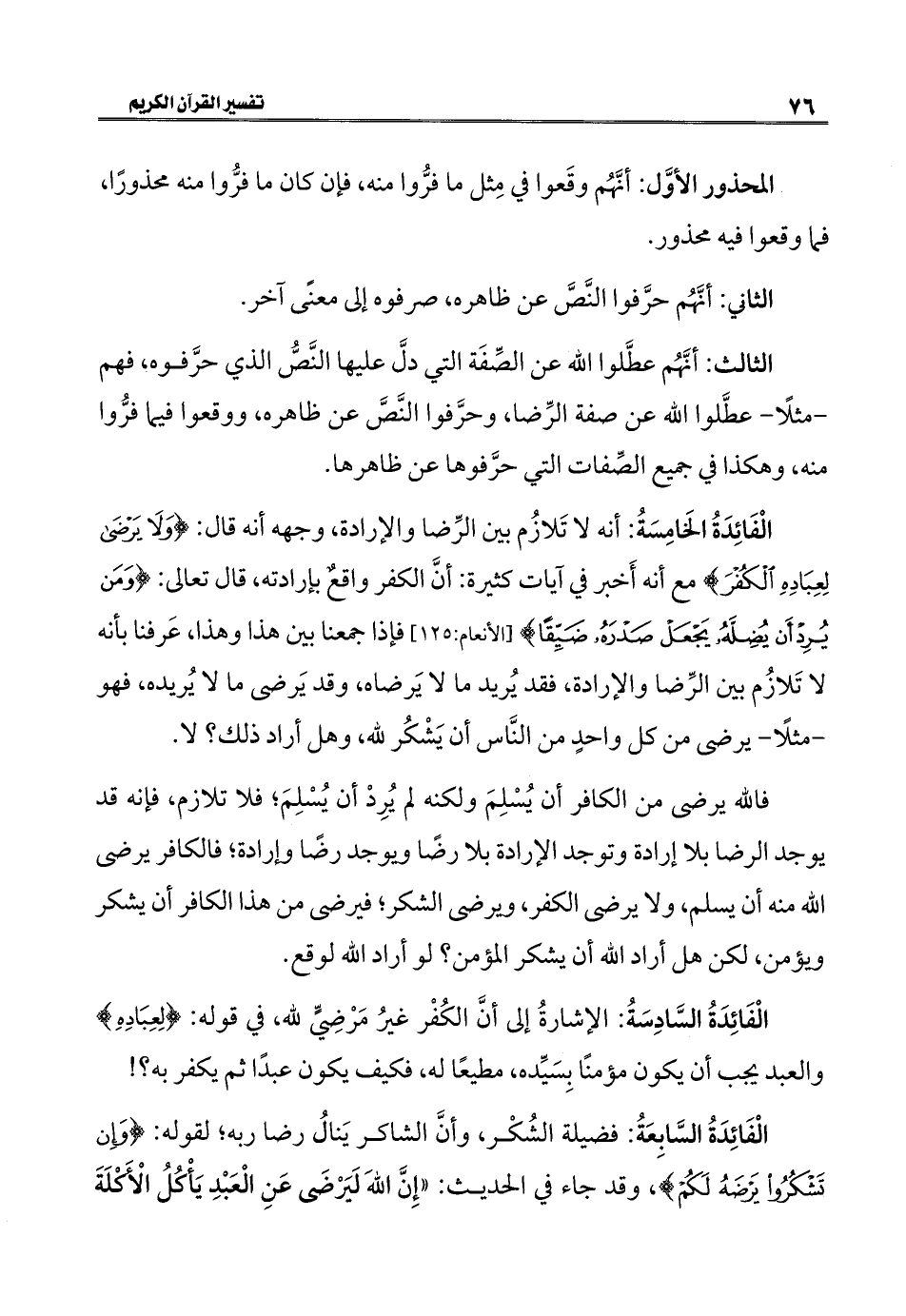 الْفَائِدَةُ الخَامِسَةُ: أنه لا تَلازُم بين الرِّضا والإرادة، وجهه أنه قال: {وَلَا يَرْضَى لِعِبَادِهِ الْكُفْرَ} مع أنه أَخبر في آيات كثيرة: أنَّ الكفر واقعٌ بإرادته، قال تعالى: {وَمَنْ يُرِدْ أَنْ يُضِلَّهُ يَجْعَلْ صَدْرَهُ ضَيِّقًا} [الأنعام: ١٢٥] فإذا جمعنا بين هذا وهذا، عَرفنا بأنه لا تَلازُم بين الرِّضا والإرادة، فقد يُريد ما لا يَرضاه، وقد يَرضى ما لا يُريده، فهو - مثلًا - يرضى من كل واحدٍ من النَّاس أن يَشْكُر لله، وهل أراد ذلك؟ لا.