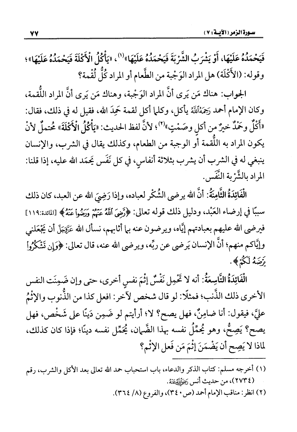 الْفَائِدَةُ الثَّامِنَةُ: أنَّ الله يرضى الشُكْر لعباده، وإذا رَضِيَ الله عن العبد، كان ذلك سببًا في إرضاء العَبْد، ودليل ذلك قوله تعالى: {رَضِيَ اللَّهُ عَنْهُمْ وَرَضُوا عَنْهُ} [المائدة: ١١٩] فيرضى الله عليهم بعبادتهم إيَّاه، ويرضون عنه بما أثابهم، نسأل الله عَزَّ وَجَلَّ أن يَجْعَلني وإيَّاكم منهم؛ أنَّ الإنسان يَرضى عن ربِّه، ويرضى الله عنه، قال تعالى: {وَإِنْ تَشْكُرُوا يَرْضَهُ لَكُمْ}.