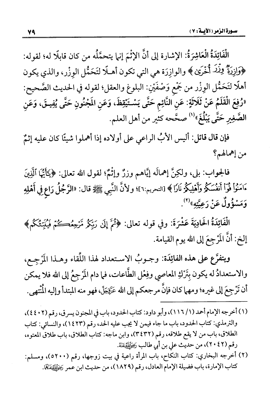 الْفَائِدَةُ الْعَاشرَةُ: الإشارة إلى أنَّ الإثْمَ إنما يتحمَّلُه من كان قابلًا له؛ لقوله: {وَازِرَةٌ وِزْرَ أُخْرَى} والوازِرَة هي التي تكون أهلًا لتَحَمُّل الوِزْر، والذي يكون أهلًا لتَحَمُّل الوِزْر من جَمْعِ وَصْفَيْنِ: البلوغ والعقل؛ لقوله في الحديث الصَّحيح: "رُفِعَ الْقَلَمُ عَنْ ثَلَاثَةٍ: عَنِ النَّائِمِ حَتَّى يَسْتَيْقِظَ، وَعَنِ المَجْنُونِ حَتَّى يُفِيقَ، وَعَنِ الصَّغِيرِ حَتَّى يَبْلُغَ" (١) صحَّحه كثير من أهل العلم.
