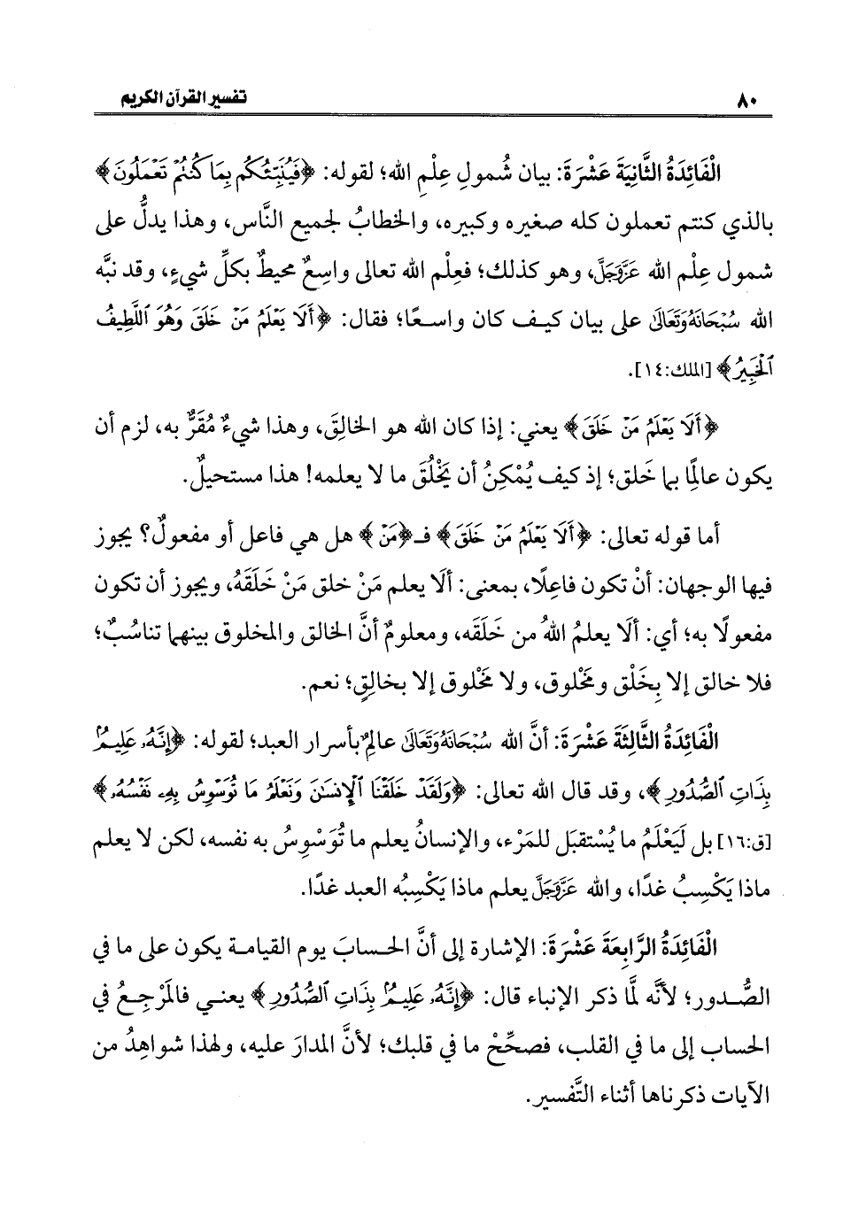 الْفَائِدَةُ الثَّانِيَةَ عَشْرَةَ: بيان شُمولِ عِلْمِ الله؛ لقوله: {فَيُنَبِّئُكُمْ بِمَا كُنْتُمْ تَعْمَلُونَ} بالذي كنتم تعملون كله صغيره وكبيره، والخطابُ لجميع النَّاس، وهذا يدلُّ على شمول عِلْم الله عَزَّ وَجَلَّ، وهو كذلك؛ فعِلْم الله تعالى واسِعٌ محيطٌ بكلِّ شيءٍ، وقد نبَّه الله سُبْحَانَهُ وَتَعَالَى على بيان كيف كان واسعًا؛ فقال: {أَلَا يَعْلَمُ مَنْ خَلَقَ وَهُوَ اللَّطِيفُ الْخَبِيرُ} [الملك: ١٤].