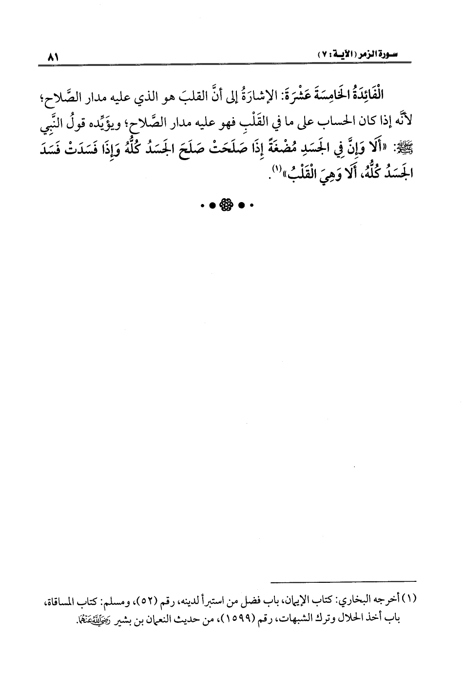 الْفَائِدَةُ الخَامِسَةَ عَشْرَةَ: الإشارَةُ إلى أنَّ القلبَ هو الذي عليه مدار الصَّلاح؛ لأنَّه إذا كان الحساب على ما في القَلْبِ فهو عليه مدار الصَّلاح؛ ويؤَيِّده قولُ النَّبِي - صلى الله عليه وسلم -: "أَلا وإِنَّ فِي الجَسَدِ مُضْغَةً إِذَا صَلَحَتْ صَلَحَ الجَسَدُ كُلُّهُ وَإِذَا فَسَدَتْ فَسَدَ الجَسَدُ كُلُّهُ، أَلا وَهِيَ الْقَلْبُ" (١).