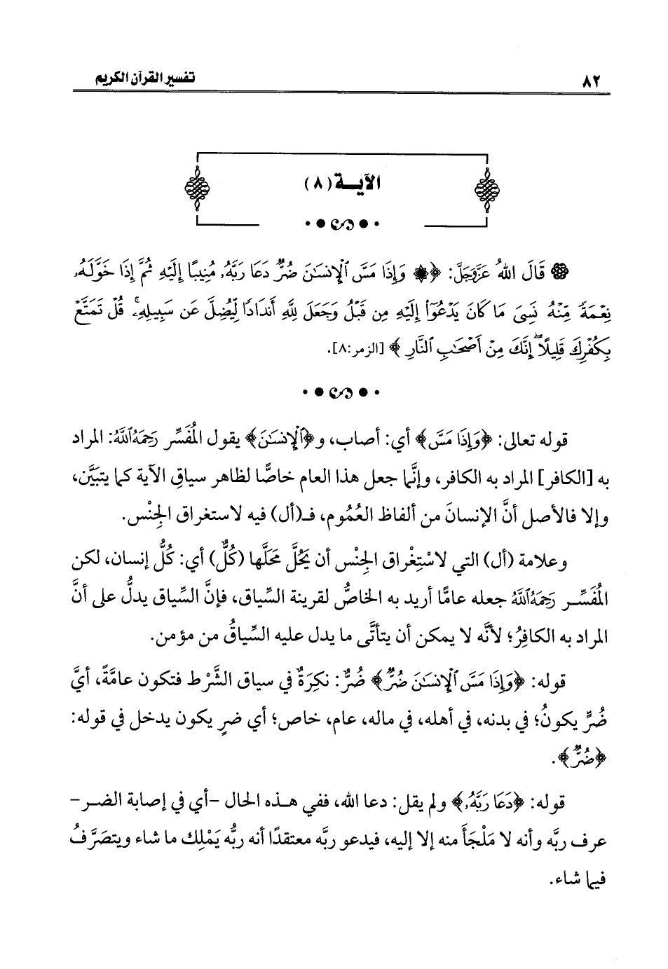 قوله تعالى: {وَإِذَا مَسَّ} أي: أصاب، و {الْإِنْسَانَ} يقول المُفَسِّر رَحِمَهُ اللهُ: المراد به [الكافر] المراد به الكافر، وإنَّما جعل هذا العام خاصًّا لظاهر سياقِ الآية كما يتبَيَّن، وإلا فالأصل أنَّ الإنسانَ من ألفاظ العُمُوم، فـ (أل) فيه لاستغراق الجِنْس.