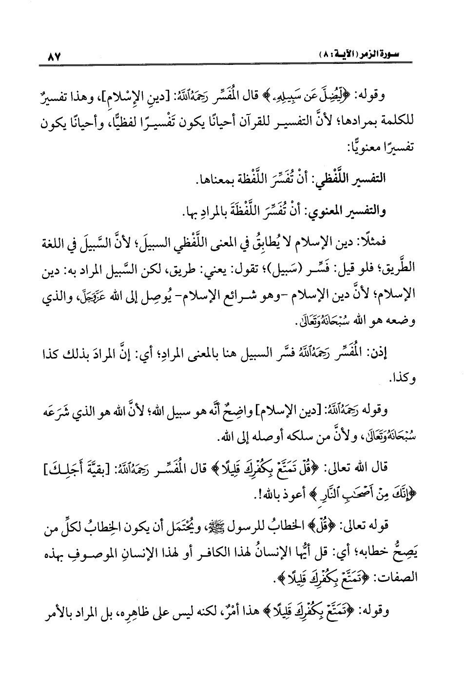 فمثلًا: دين الإسلام لا يُطابِقُ في المعنى اللَّفْظي السبيلَ؛ لأنَّ السَّبيلَ في اللغة الطَّريق؛ فلو قيل: فَسِّر (سَبيل)؛ تقول: يعني: طريق، لكن السَّبيل المراد به: دين الإسلام؛ لأنَّ دين الإسلام - وهو شرائع الإسلام - يُوصِل إلى الله عَزَّ وَجَلَّ، والذي وضعه هو الله سُبْحَانَهُ وَتَعَالَى.